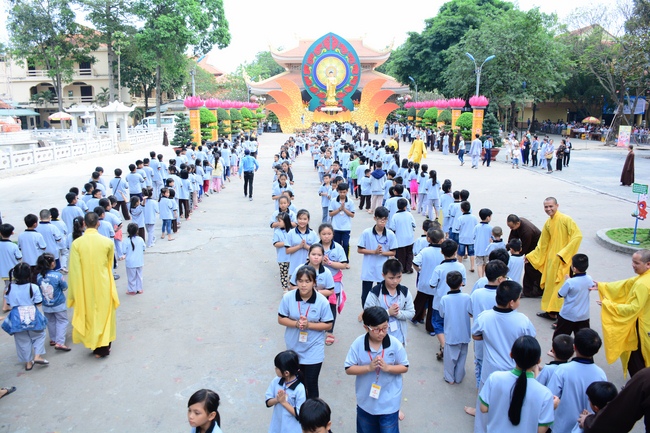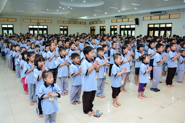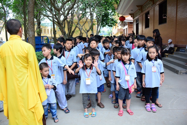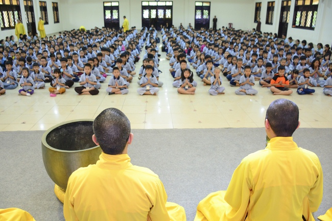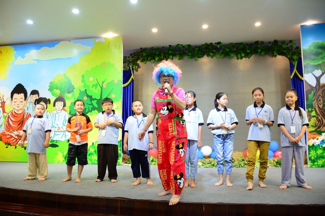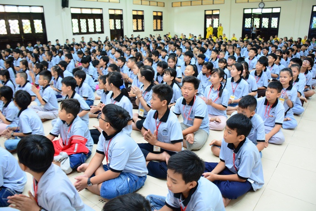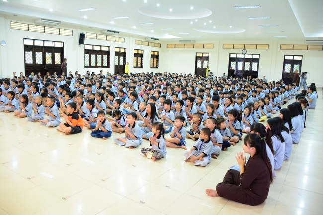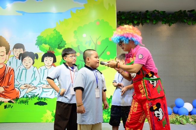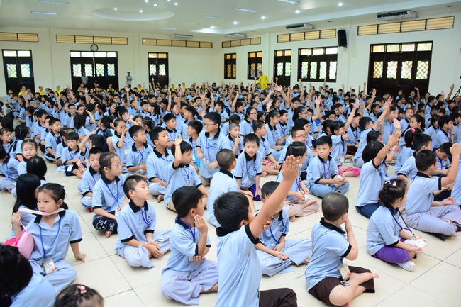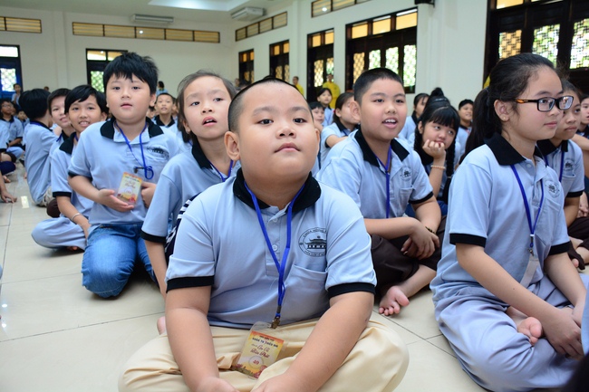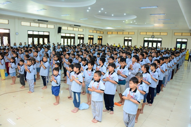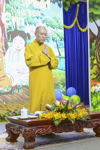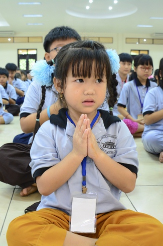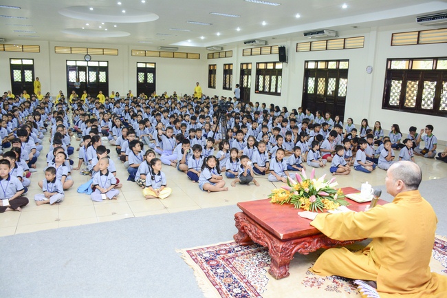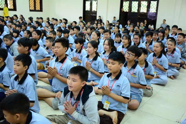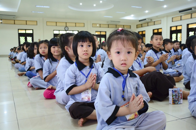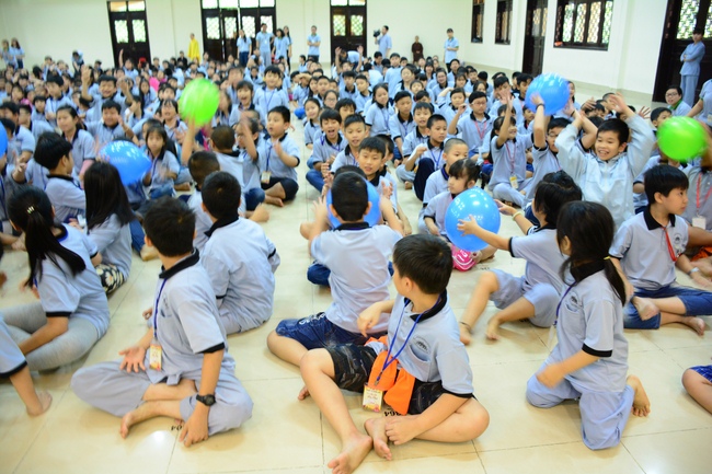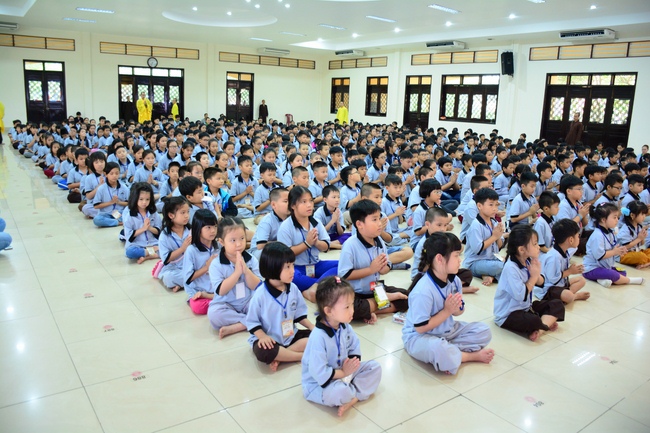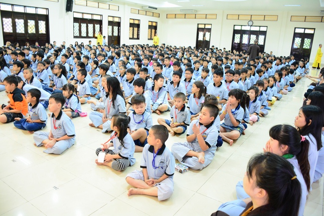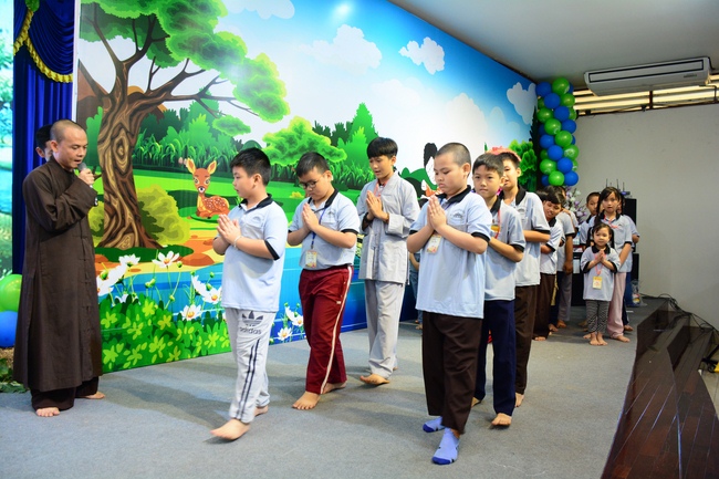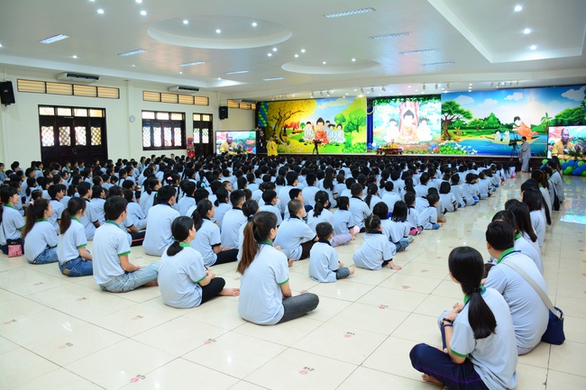 After registration in the morning, children gathered at the main hall to listen to a short Dharma talk from Senior Venerable Thich Chan Tinh, Head of Organizing Committee. He skillfully taught kids how to be mindful with body, speech, and mind, perform Buddhism etiquette when walking, standing, lying and sitting, pressing palm together, bowing, kowtowing in front of Buddha statue and clergy people via the poem: