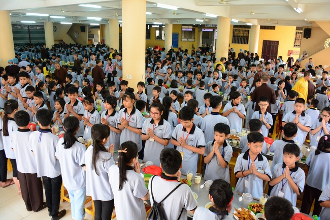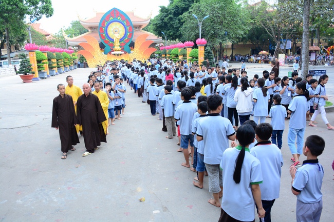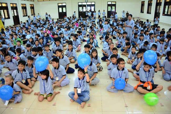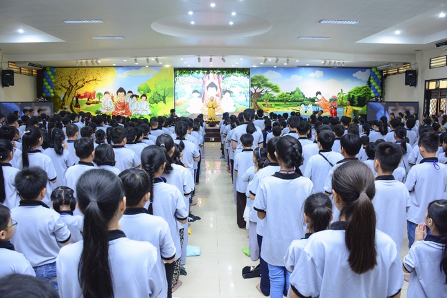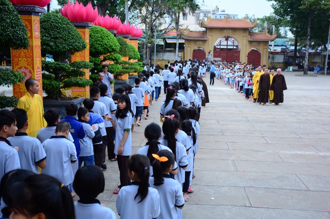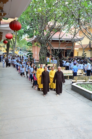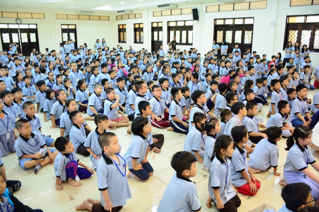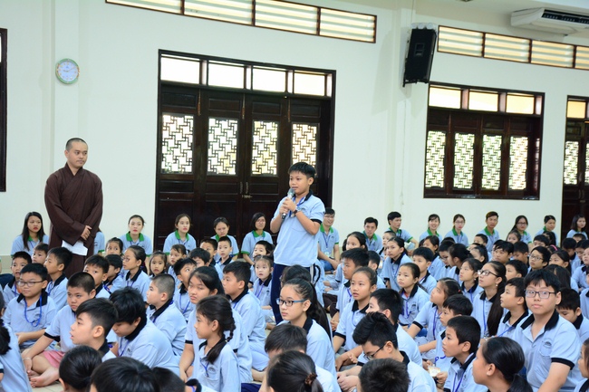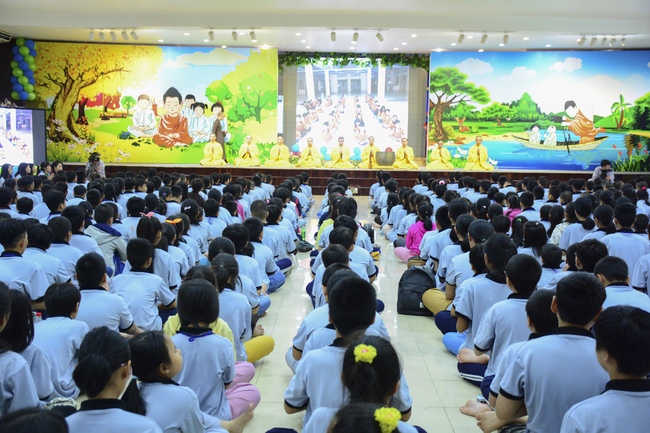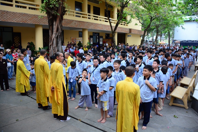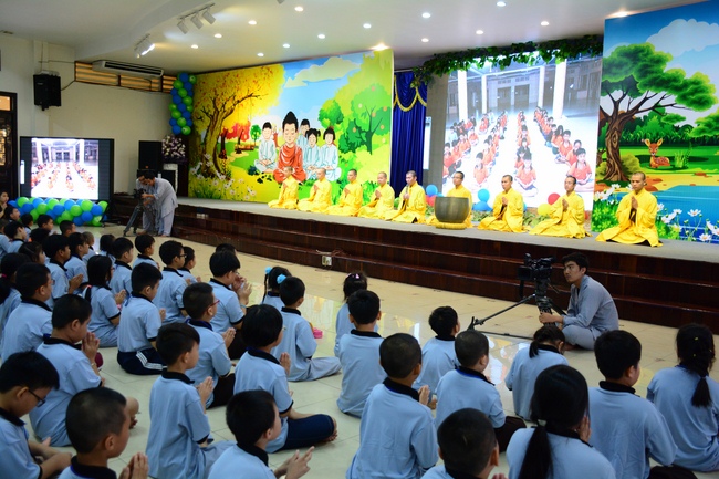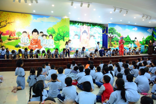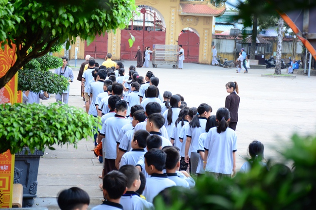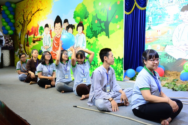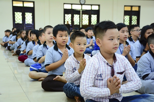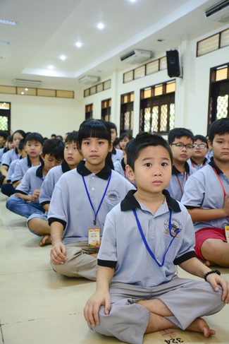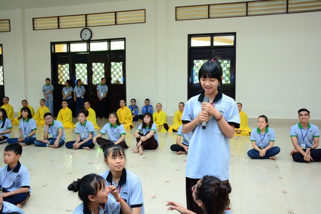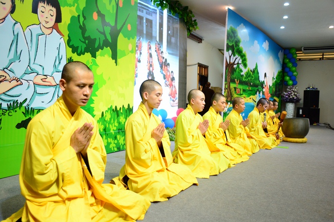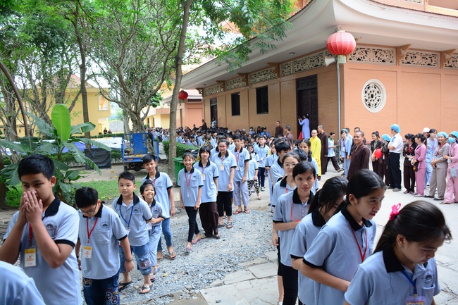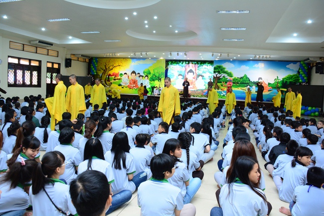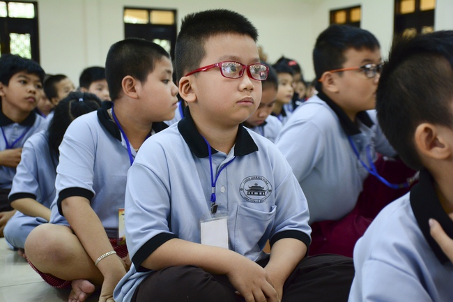 After registration in the morning, children gathered at the main hall to listen to a short Dharma talk from Senior Venerable Thich Chan Tinh, Head of Organizing Committee. He skillfully taught kids how to be mindful with body, speech, and mind, perform Buddhism etiquette when walking, standing, lying and sitting, pressing palm together, bowing, kowtowing in front of Buddha statue and clergy people via the poem:
