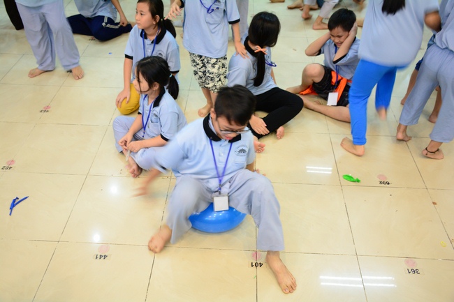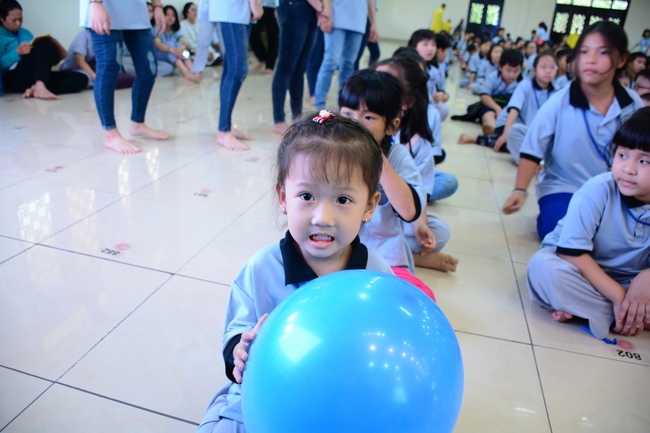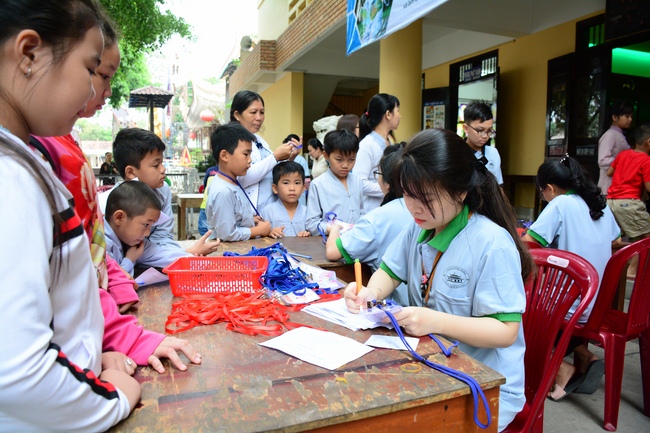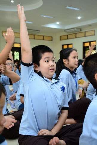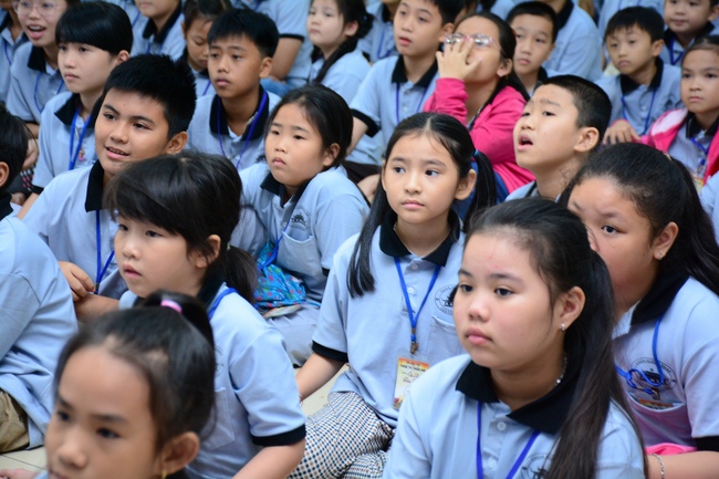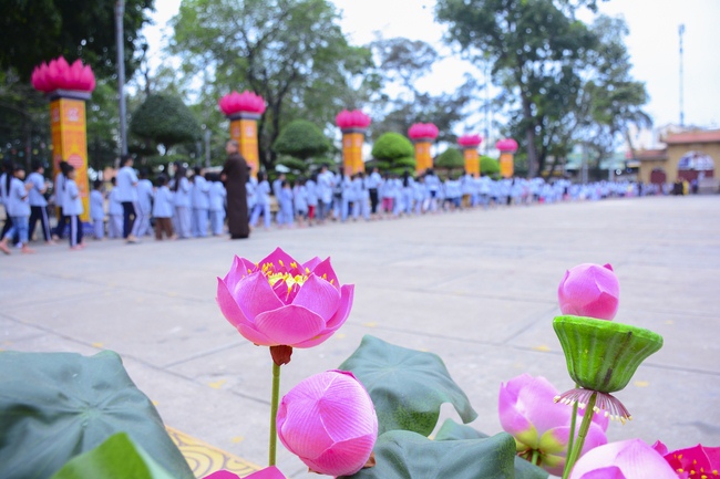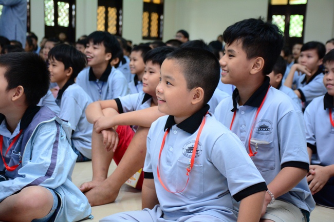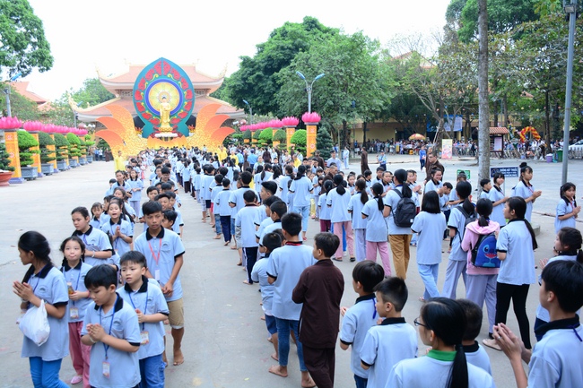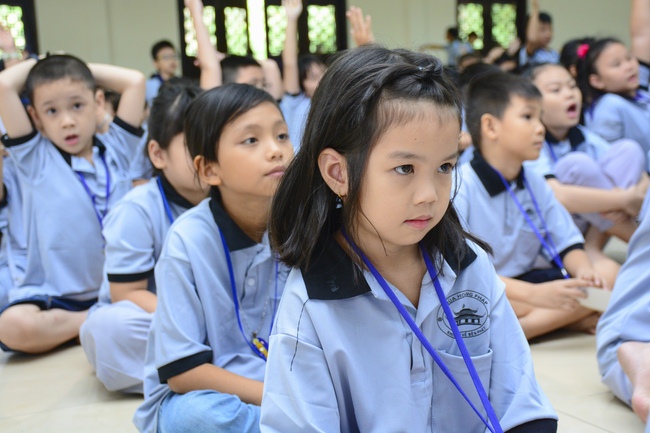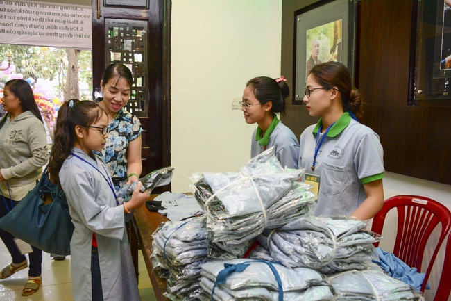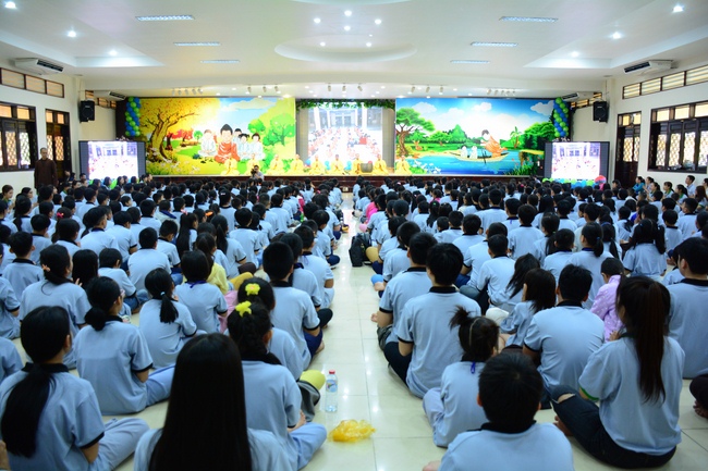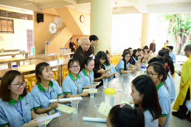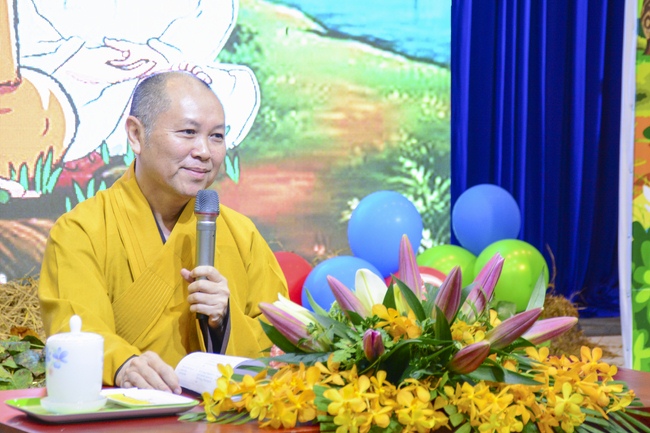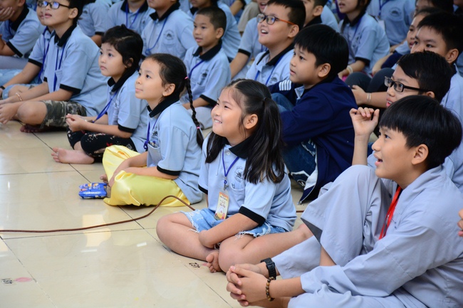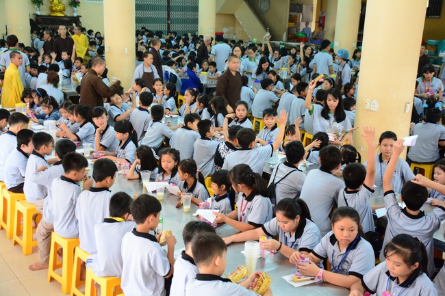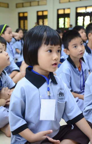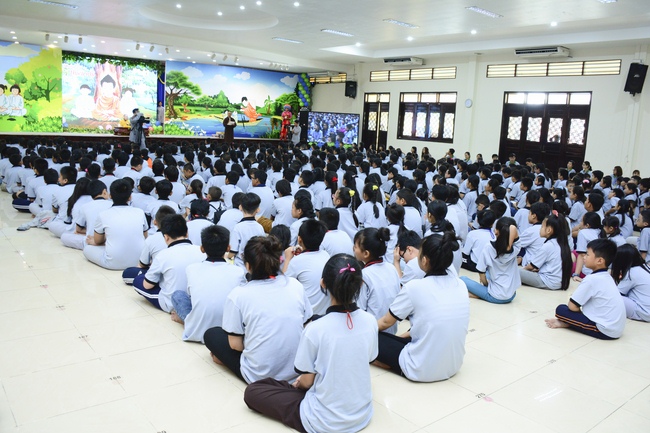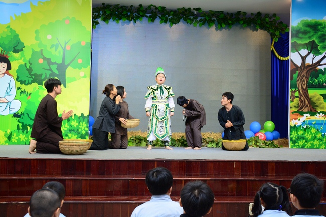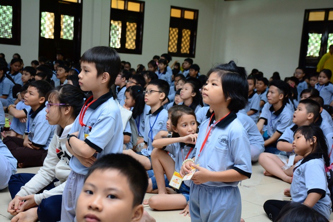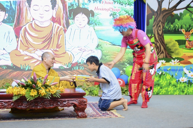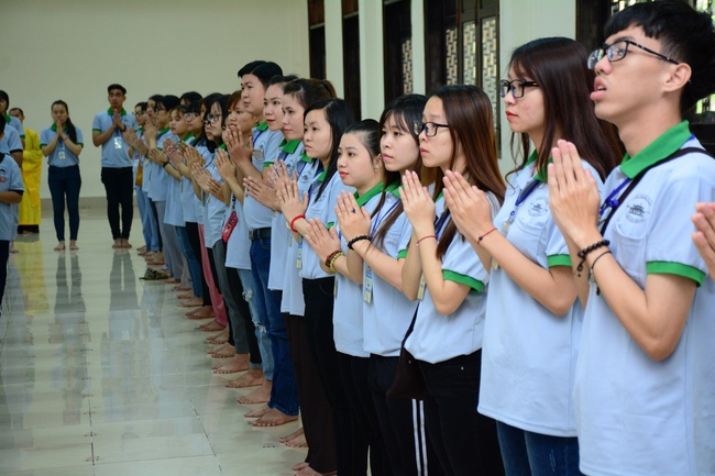 After registration in the morning, children gathered at the main hall to listen to a short Dharma talk from Senior Venerable Thich Chan Tinh, Head of Organizing Committee. He skillfully taught kids how to be mindful with body, speech, and mind, perform Buddhism etiquette when walking, standing, lying and sitting, pressing palm together, bowing, kowtowing in front of Buddha statue and clergy people via the poem: