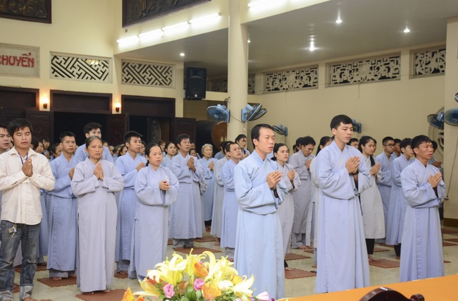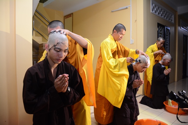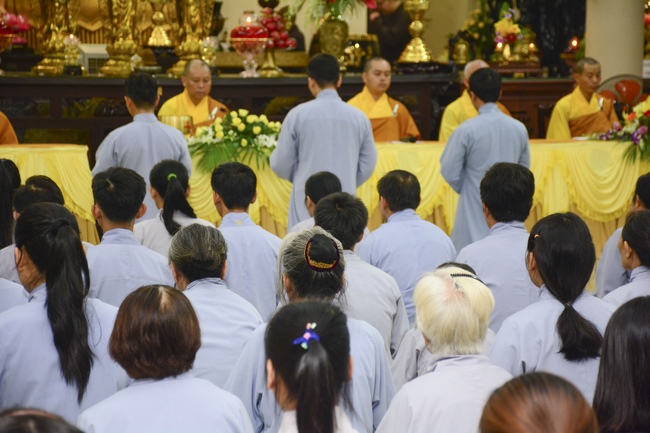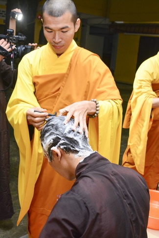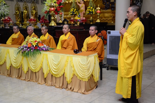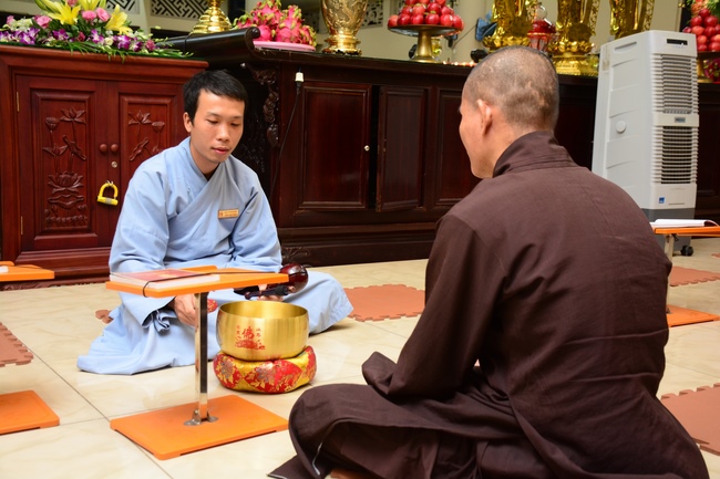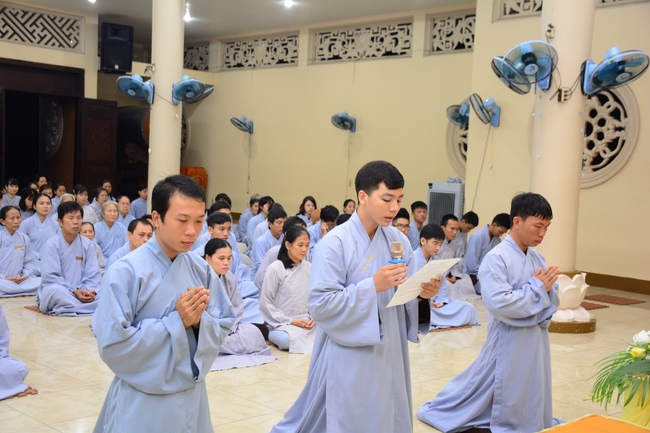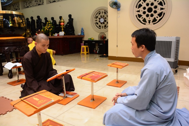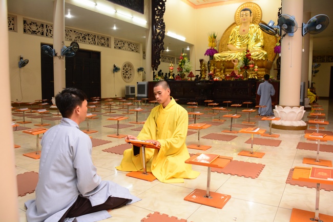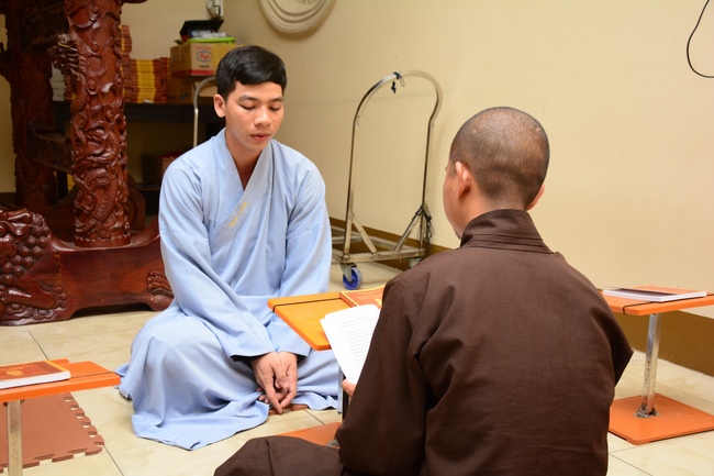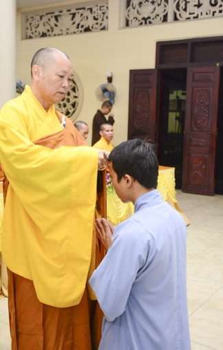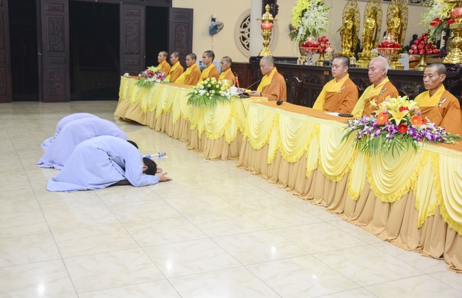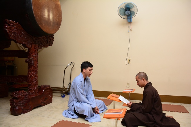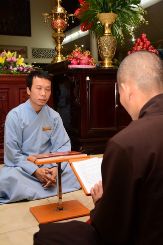 After offering incense to Buddha in the main shrine, representative of the aspirants offers the appeal for the renouncement rite. Senior Venerable Thich Chan Tinh, abbot of Hoang Phap Pagoda has approved the appeal and given them Dharma talk as the advice before the main rite. Renouncement includes leaving the secular household life, the house of affliction and the house of tri-world of samsara.
