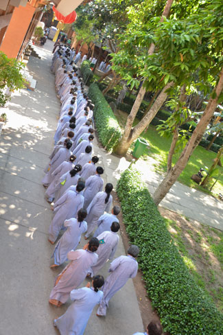 At the hall areas in the morning of the first retreat day,\r\nBuddhists were guided the basic demeanors such as walking, standing, lying,\r\nsitting, prostrating, ceremonies of worshipping, or fixed accommodation, lunch,\r\nand listening areas by Monks.