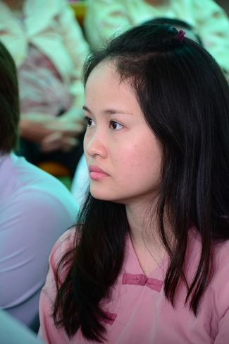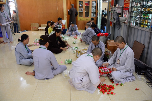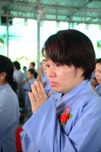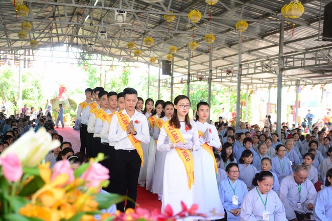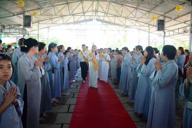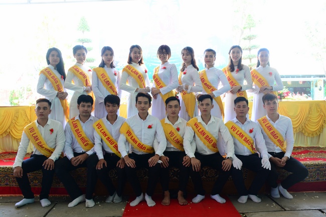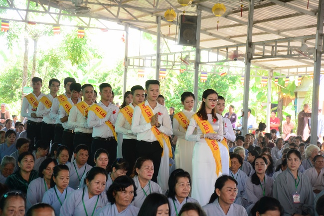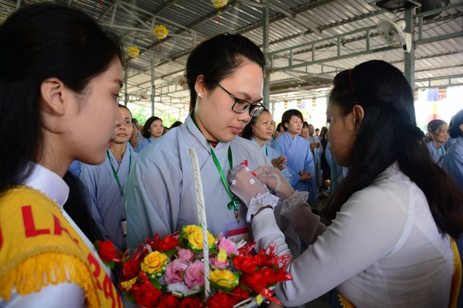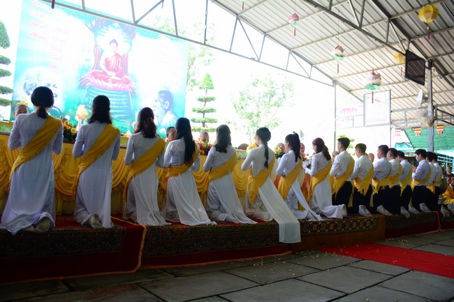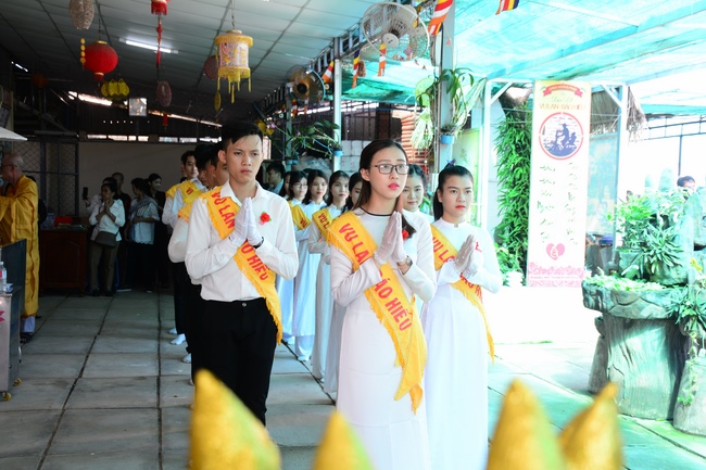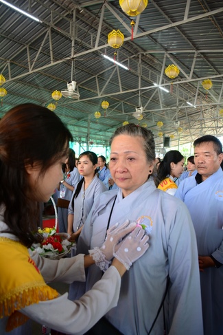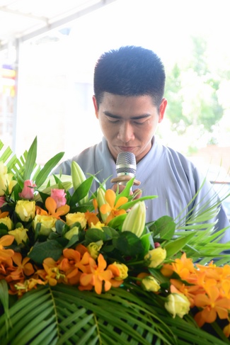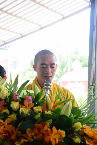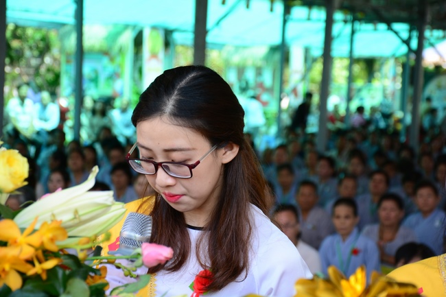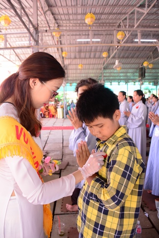 After the rite of reciting the Buddha‘s name for support, declaration of reason, introducing the program and guests, Junior Ven. Thich Tam Truc read the opening speech. Next, it was the reading about rose pinning. A minute of repentance is a quiet moment that attendees get their mind reflection, think about their mistakes to dad and mum. Continuously, young Buddhists deputize the mass respectfully offered alms to the Venerables.