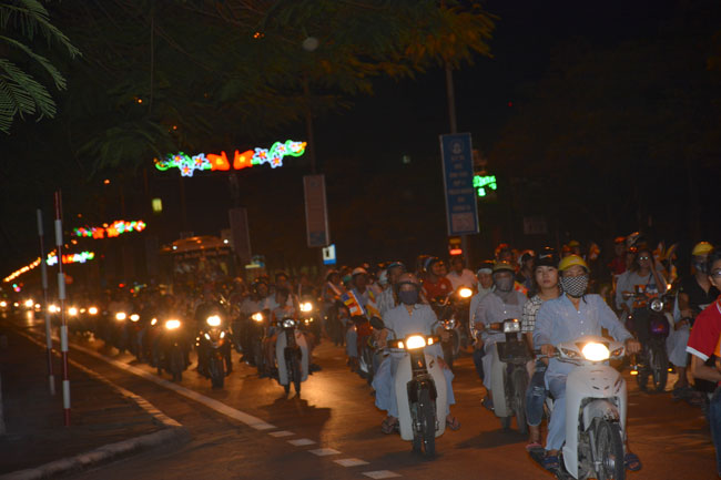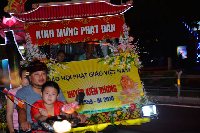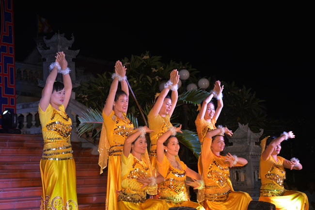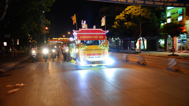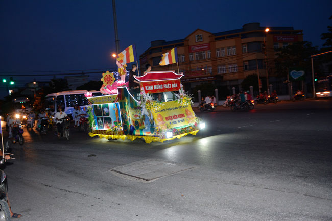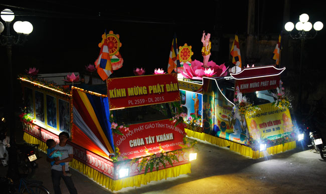 The night performance and carriages decorated with flowers parade to welcome the Buddha"s birthday at Tay Khanh Pagoda - Thai Binh province.