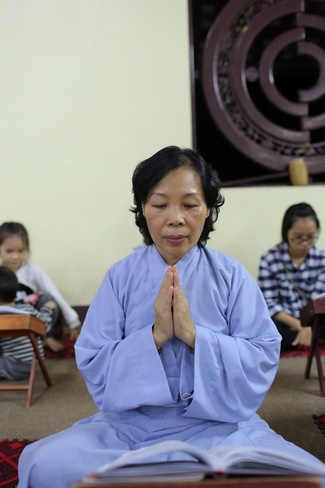 Two young couples are practising at Hoa Phuc pagoda. Trung Thinh was born in a Buddhist family, whose father and mother are vegans for many years. The groom is a responsible member of services of Hoa Phuc pagoda and had many propagational contribution.