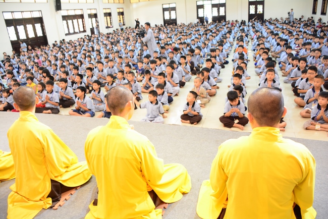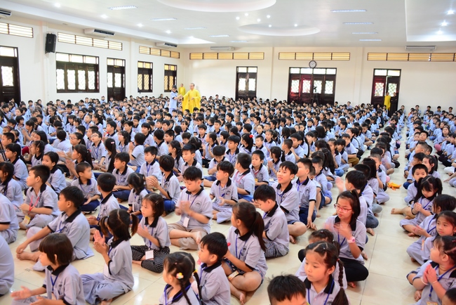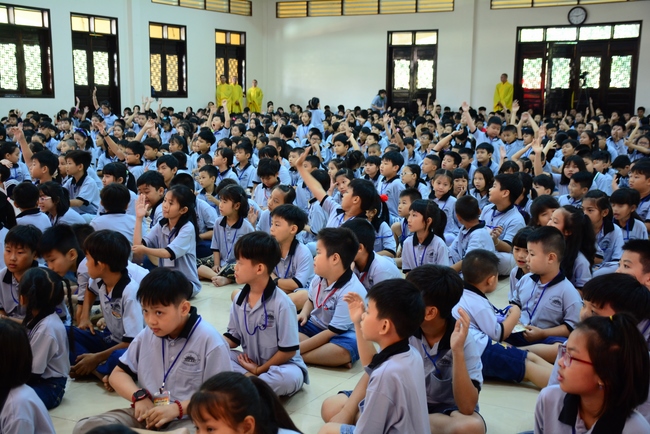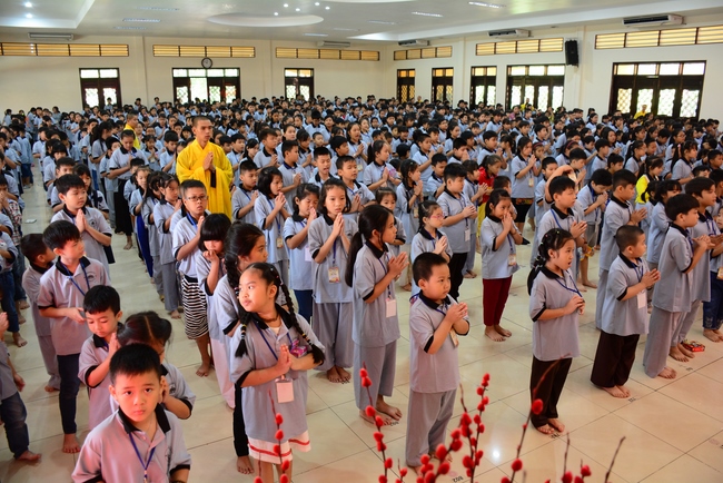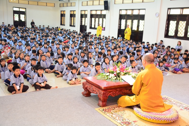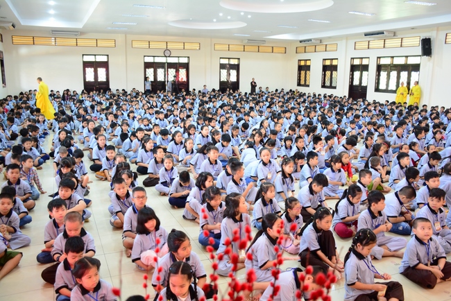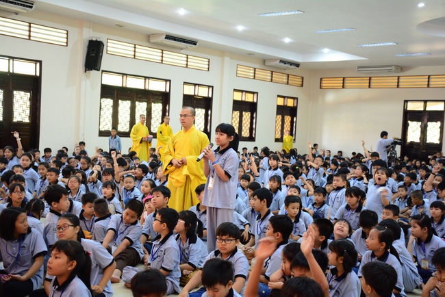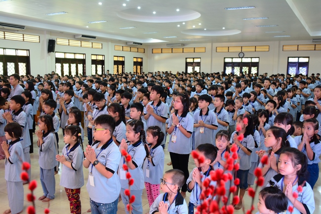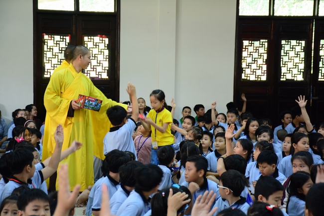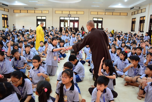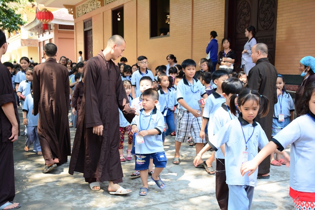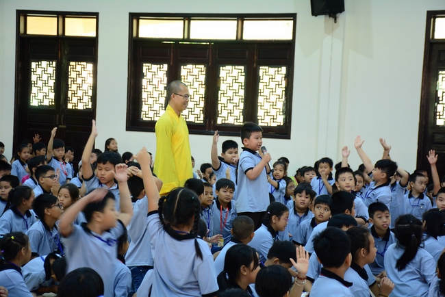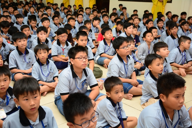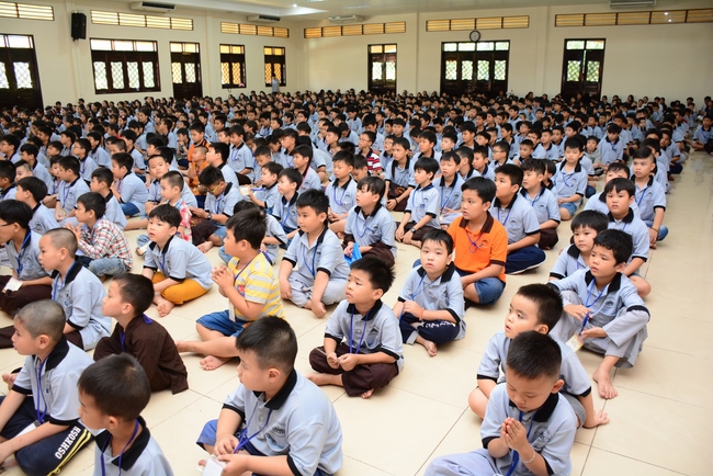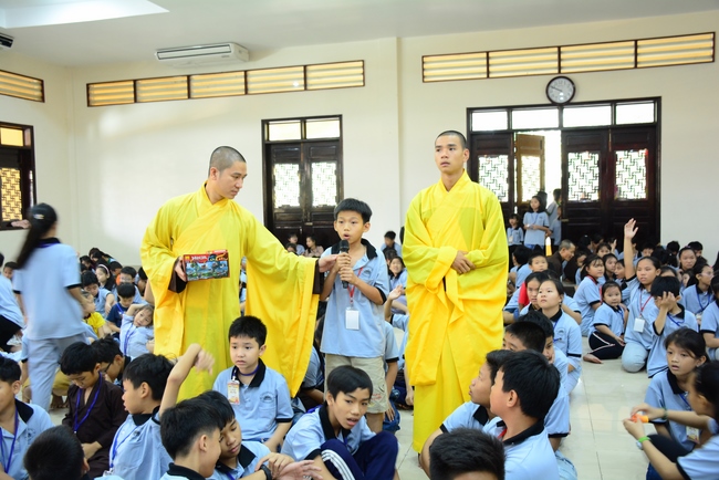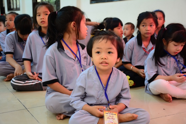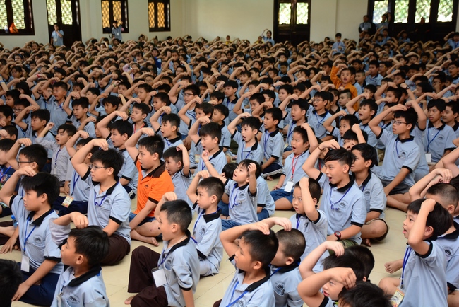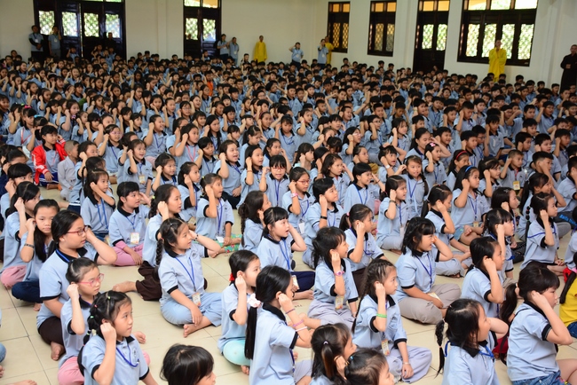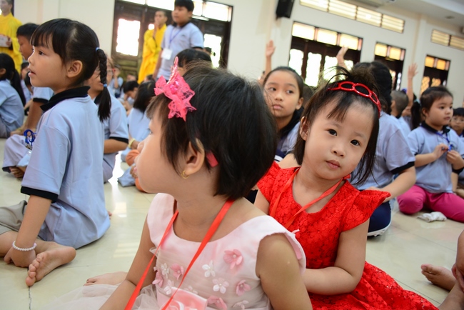 After register in the morning, the monks instructed all of them to the main lecture room for their activity and then they listened to a dharma talk by Senior Ven. Thich Chan Tinh, the Chief of organizers at the retreat. His speech was short of three paragraphs on the understandable and simple words in spite it transfers more deep meanings. Combining between learning ethics, playing activities and receiving gifts, etc, the children have had the impressive and lively lessons about moral, culture, and behavior which helps inscribe on their spirit.