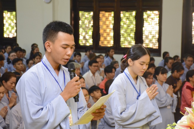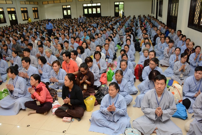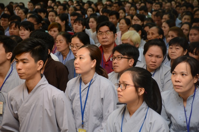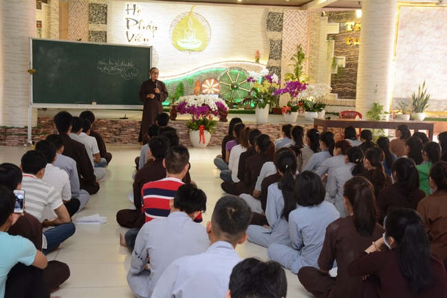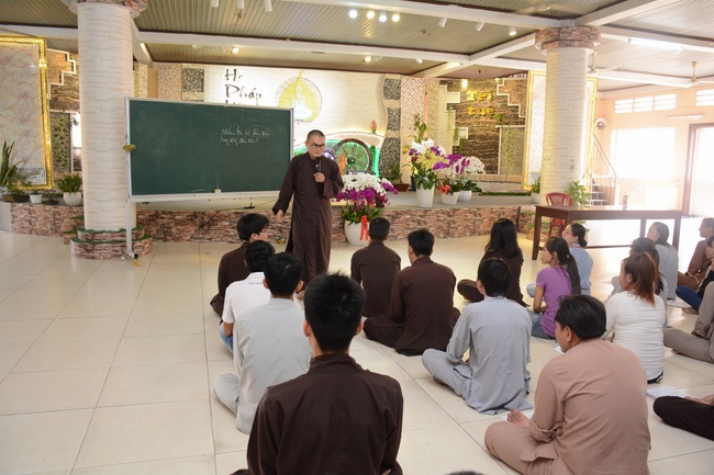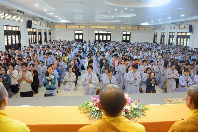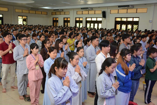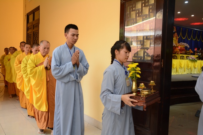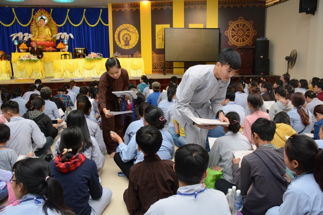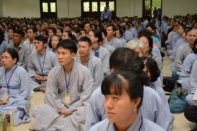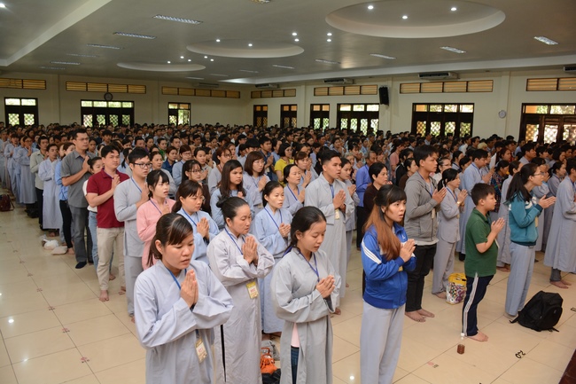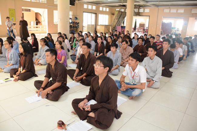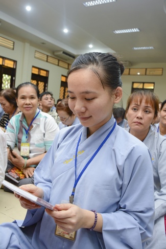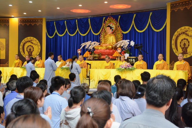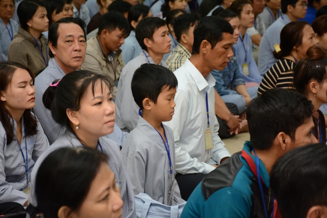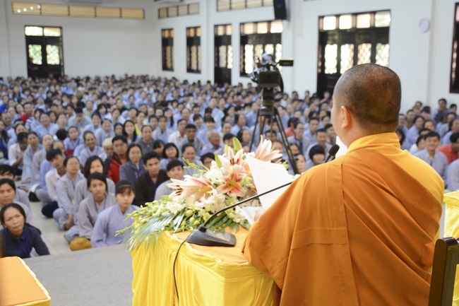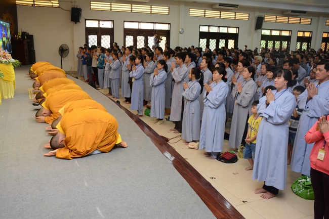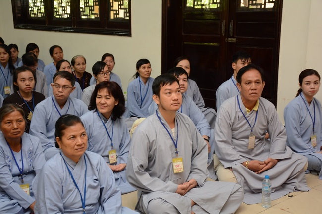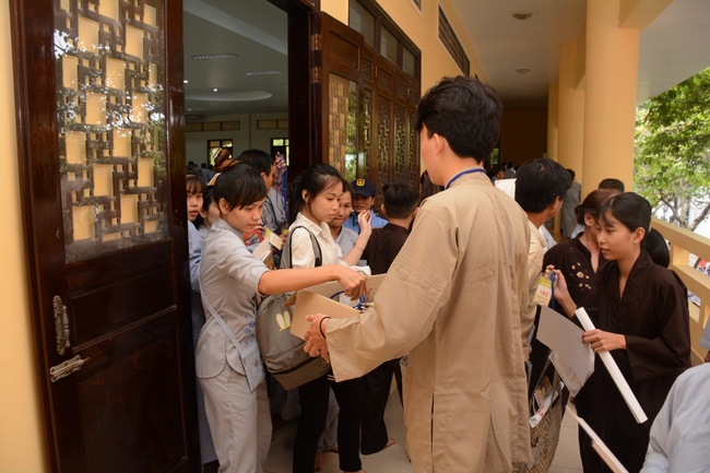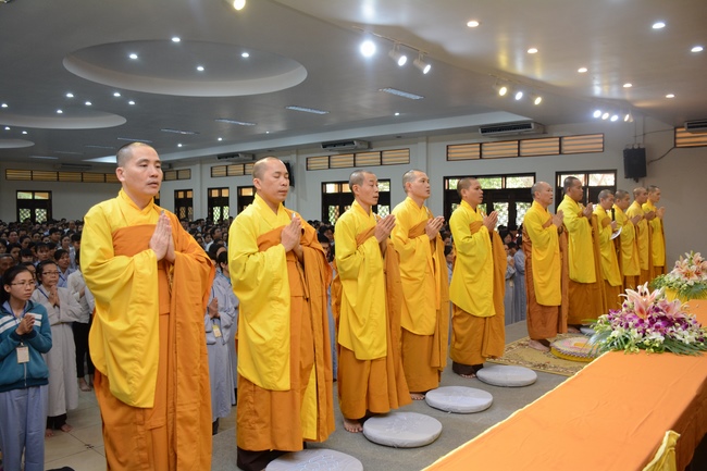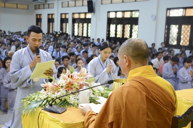 It takes one day for participants to join the entire ceremony. In the morning, everyone gathered at lecture halls for orientation course from Venerable Thich Tam Dao, Deputy Abbot of Hoang Phap, regarding Buddhism fundamentals (as taking refuge in Triratna, Five precepts, lay members, original master (holding Refuge ceremony for aspirant), abiding master (teaching religious matters to Buddhist when s/he cannot get the teachings from his/her original master due to some reasons)) and Buddhism etiquette (as pressing palm together, bowing, kowtowing, and lunch praying rite.