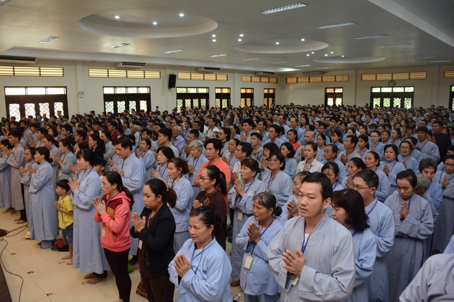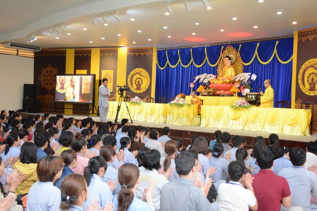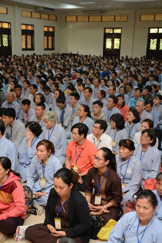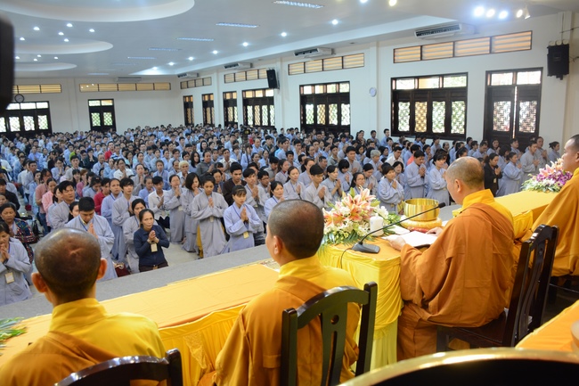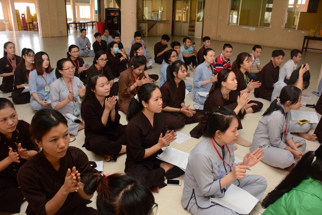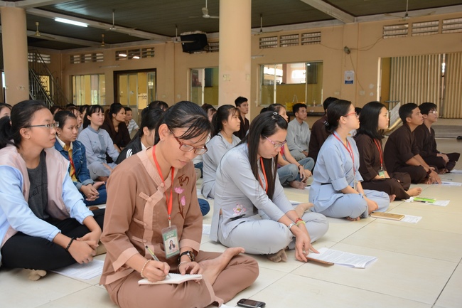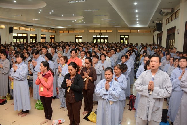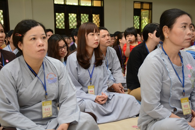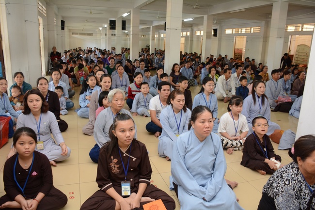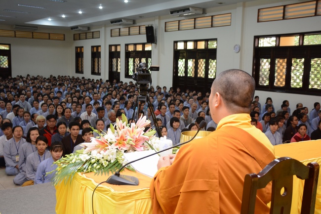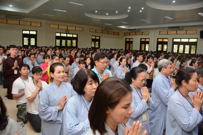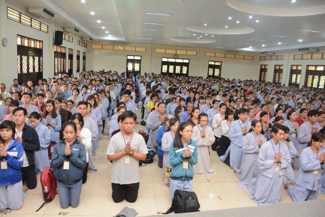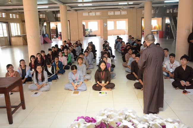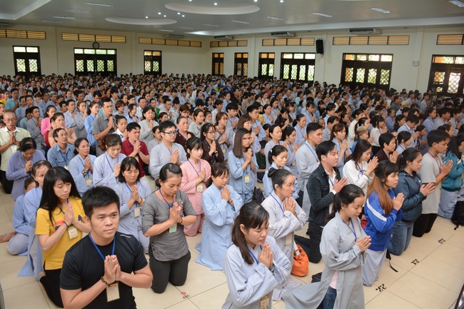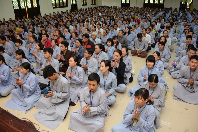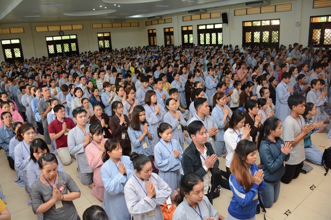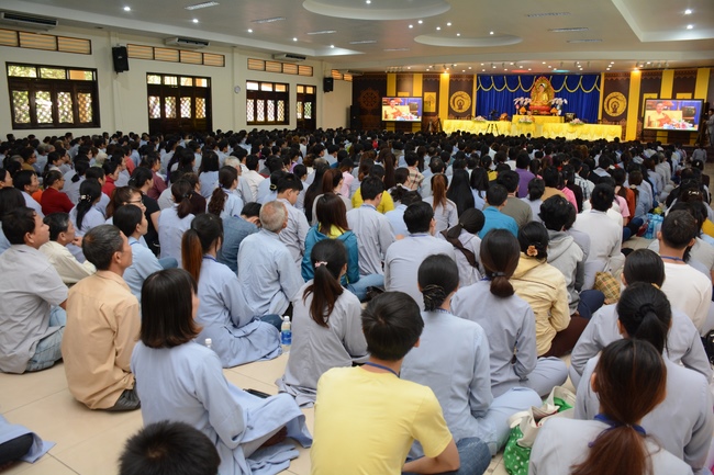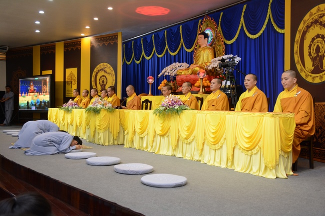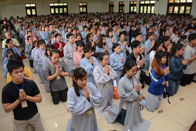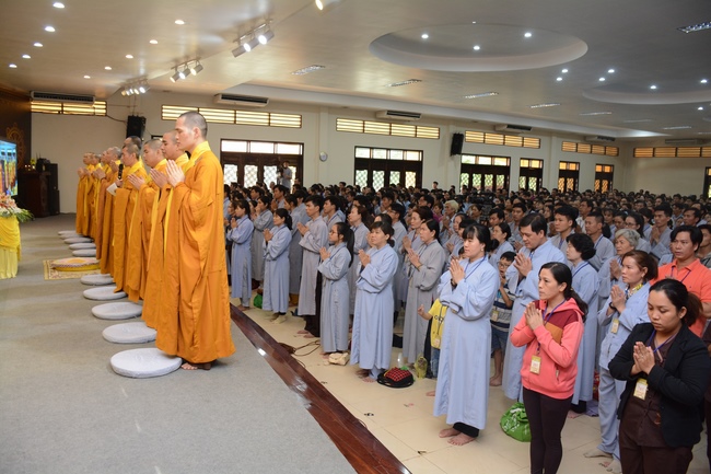 It takes one day for participants to join the entire ceremony. In the morning, everyone gathered at lecture halls for orientation course from Venerable Thich Tam Dao, Deputy Abbot of Hoang Phap, regarding Buddhism fundamentals (as taking refuge in Triratna, Five precepts, lay members, original master (holding Refuge ceremony for aspirant), abiding master (teaching religious matters to Buddhist when s/he cannot get the teachings from his/her original master due to some reasons)) and Buddhism etiquette (as pressing palm together, bowing, kowtowing, and lunch praying rite.