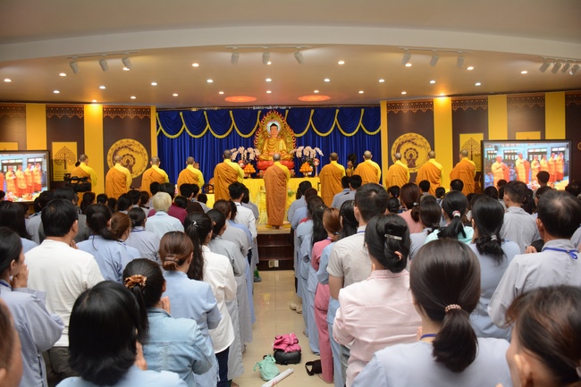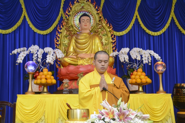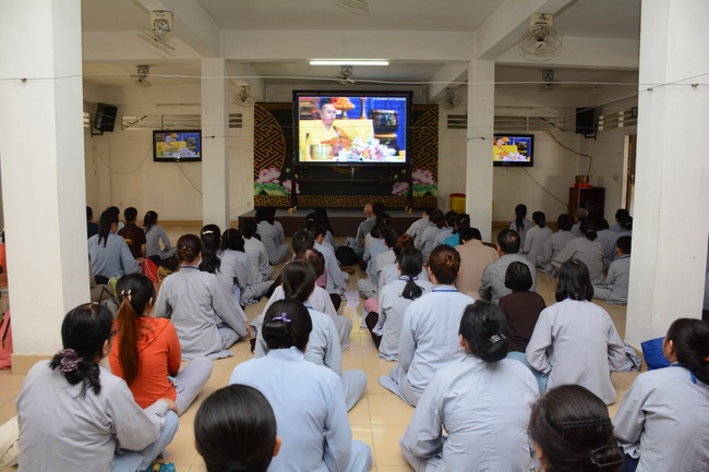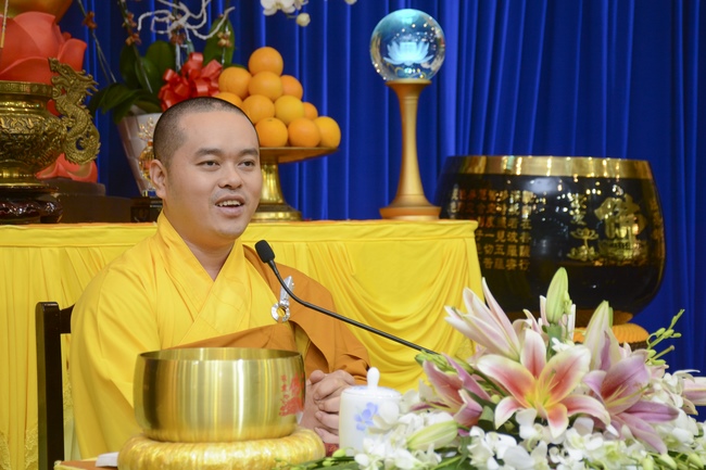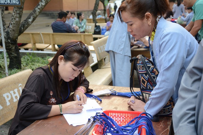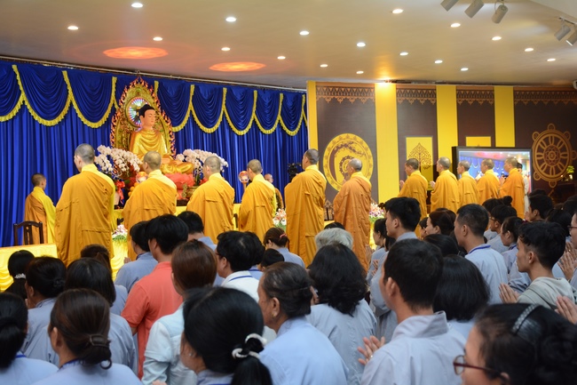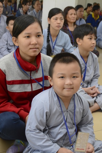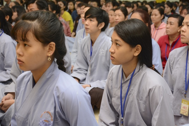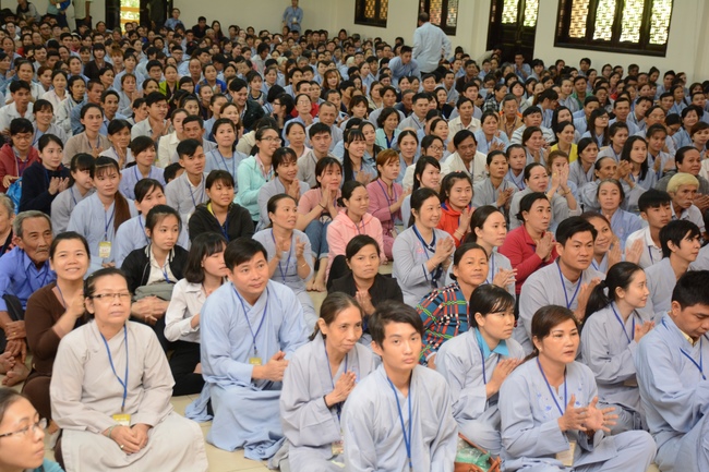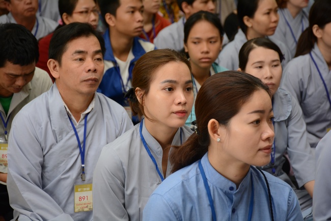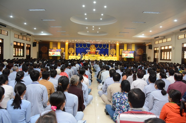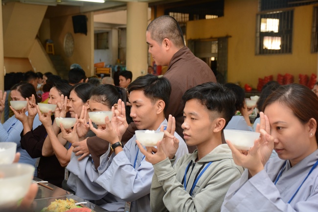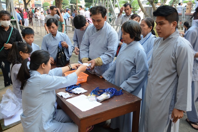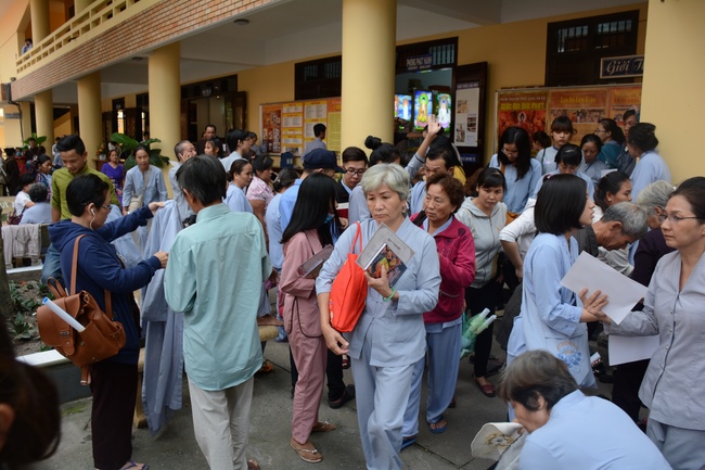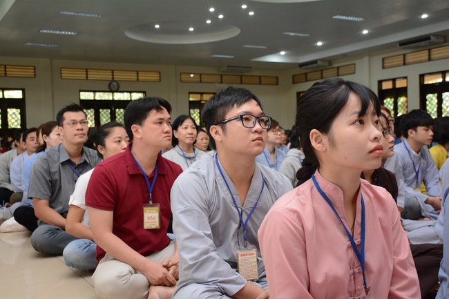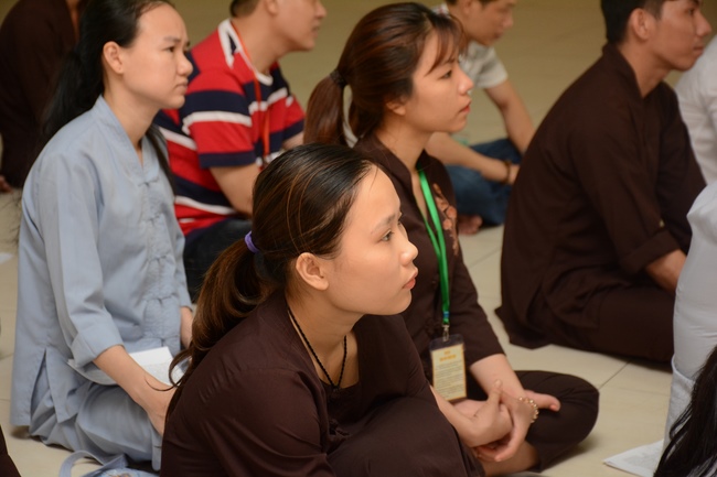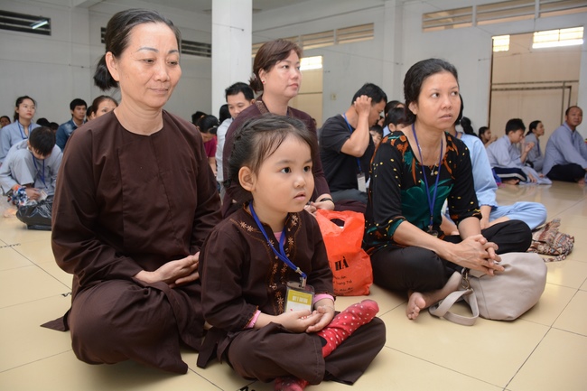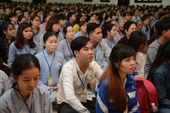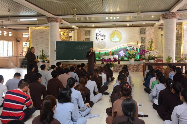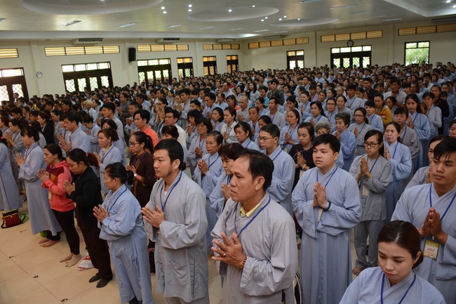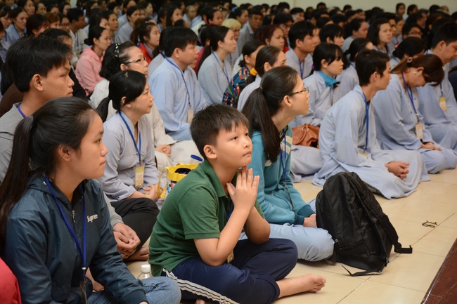 It takes one day for participants to join the entire ceremony. In the morning, everyone gathered at lecture halls for orientation course from Venerable Thich Tam Dao, Deputy Abbot of Hoang Phap, regarding Buddhism fundamentals (as taking refuge in Triratna, Five precepts, lay members, original master (holding Refuge ceremony for aspirant), abiding master (teaching religious matters to Buddhist when s/he cannot get the teachings from his/her original master due to some reasons)) and Buddhism etiquette (as pressing palm together, bowing, kowtowing, and lunch praying rite.