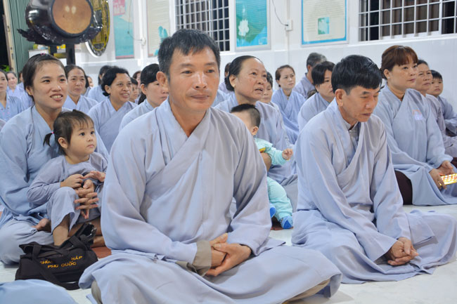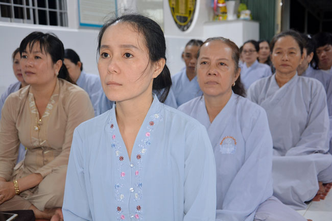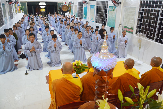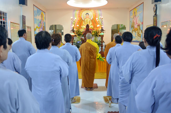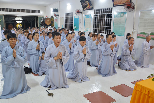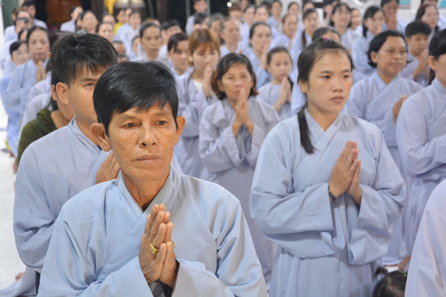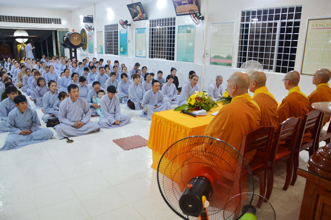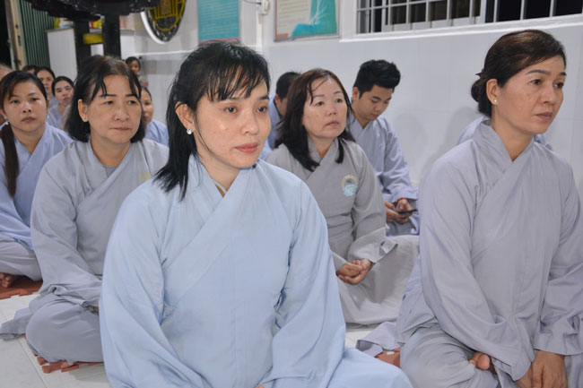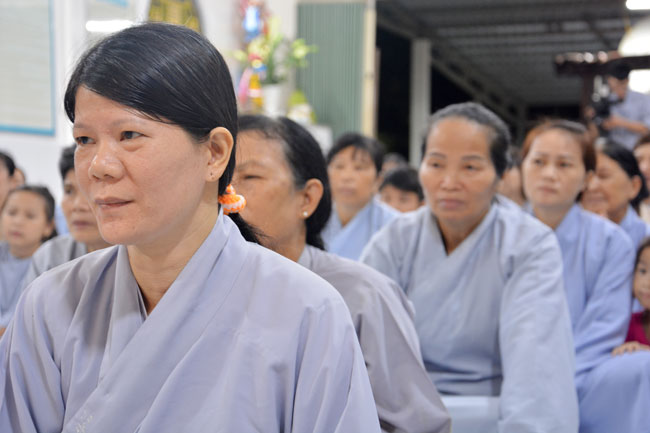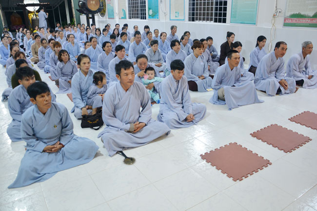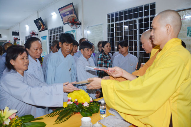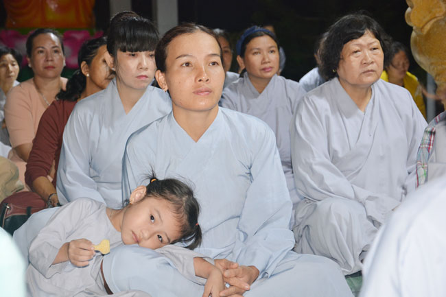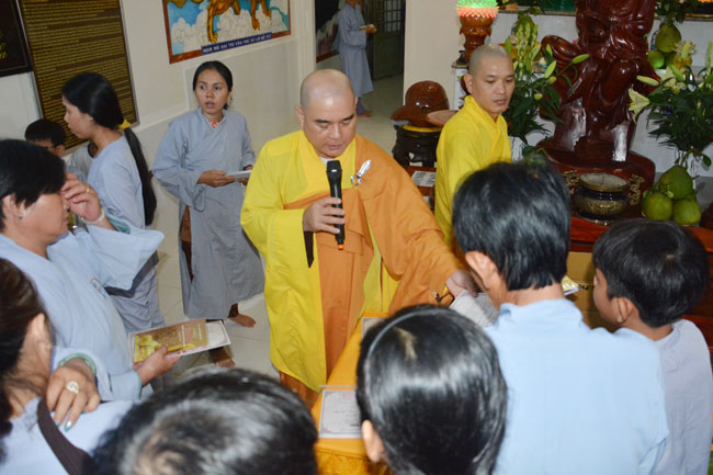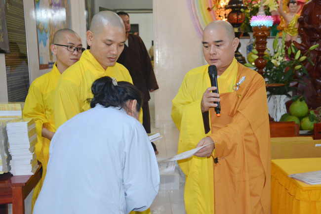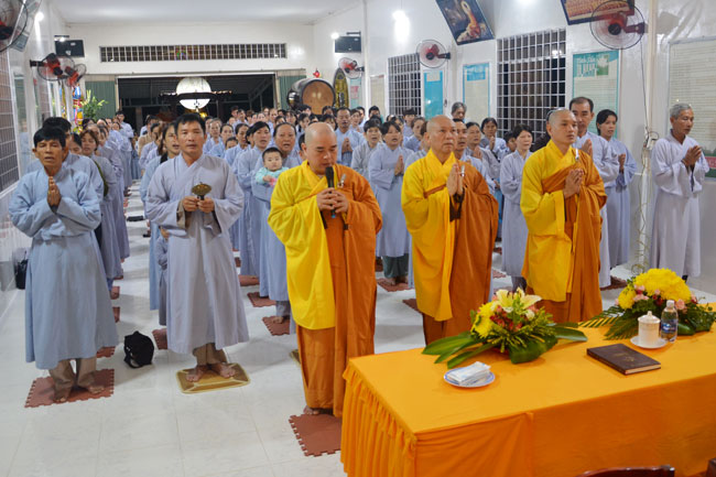At 7:00PM, the ceremony began with incensing reading the Sutras to Buddha. The Abbots took turn teaching about the five commandments for Buddhists. After that, Abbot Thich Chan Tinh had some words to the Buddhists, he preaching about the duties of the Buddhists to The Three Previous Ones. Because the ceremony is very important for those who wants to become a Buddhist and because there were only a few chances to meet wise men. Everyone listened to the Abbot carefully. Next, all the Buddhists knelt down and held their hands, looked above to The Three Previous Ones and wished to the Buddha, the Dharma, the Sangha. The Buddhists also received Five Commandments from the Abbot.