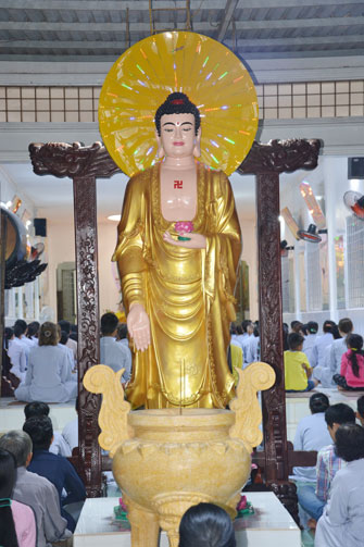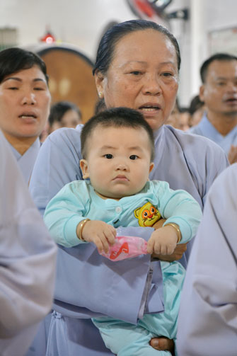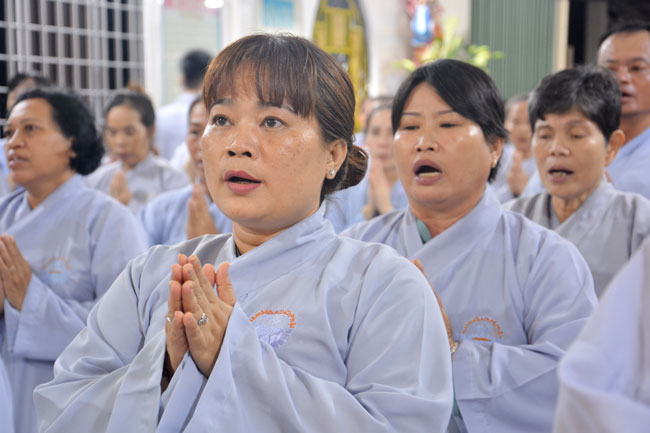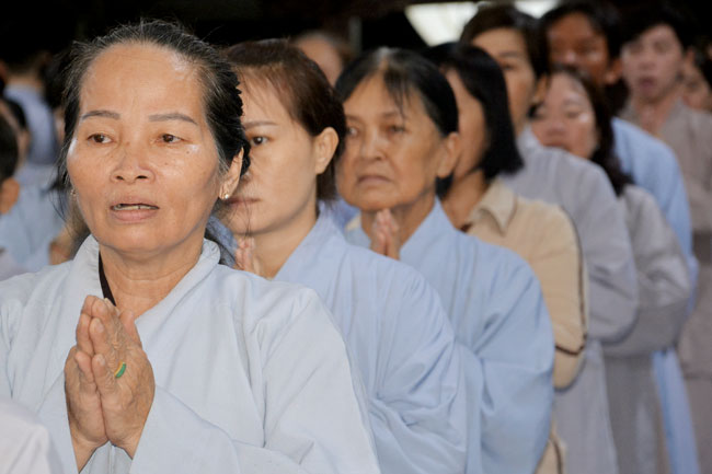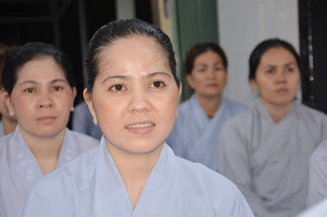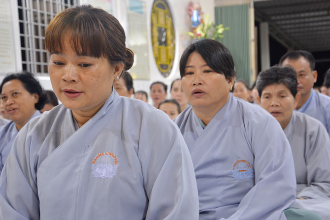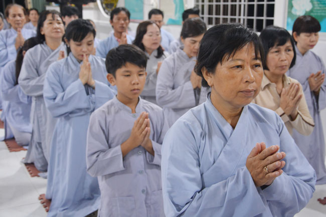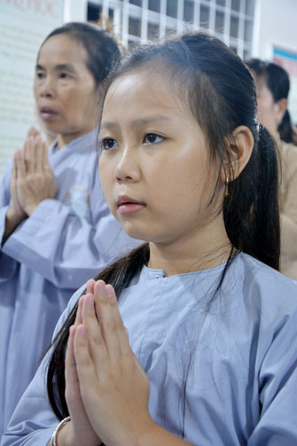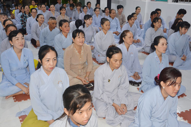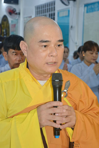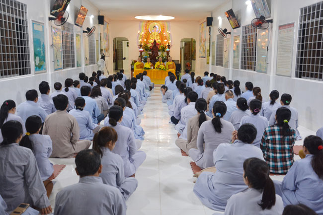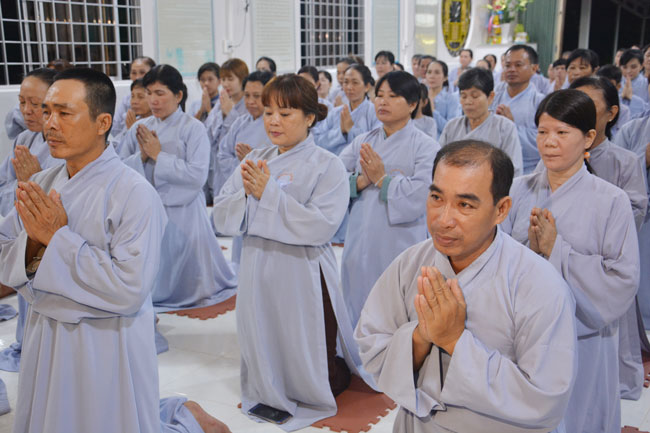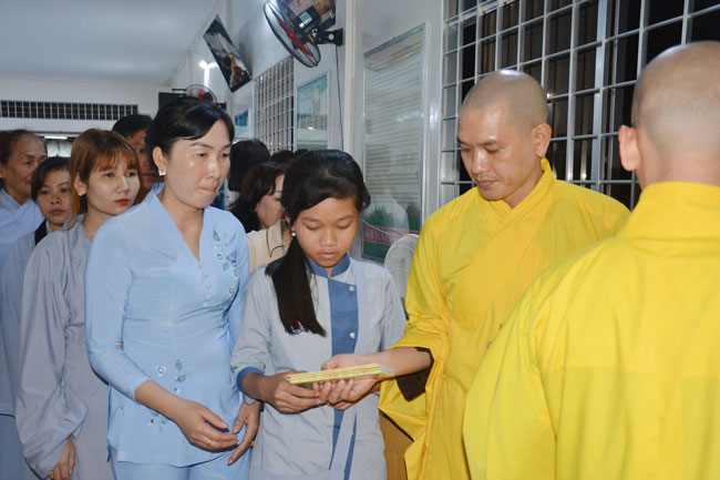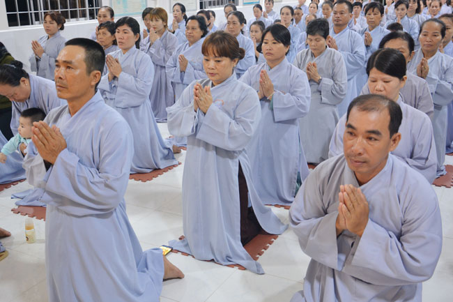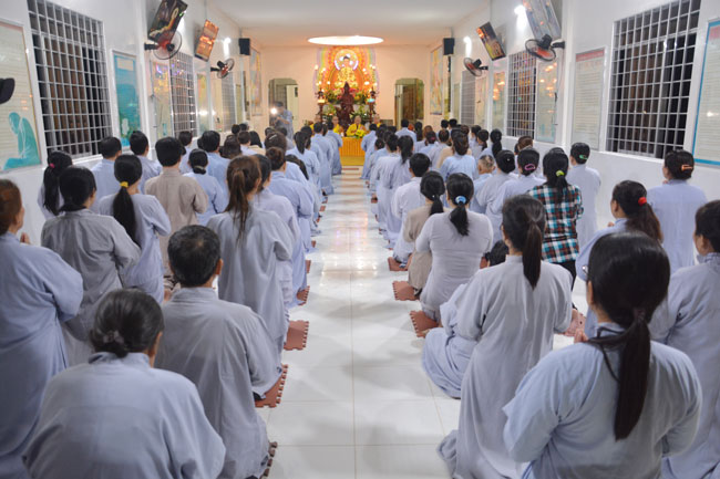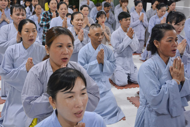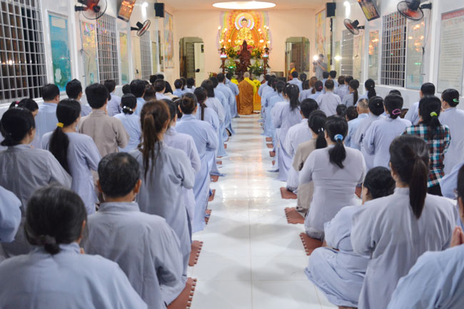 At 7:00PM, the ceremony began with incensing reading the Sutras to Buddha. The Abbots took turn teaching about the five commandments for Buddhists. After that, Abbot Thich Chan Tinh had some words to the Buddhists, he preaching about the duties of the Buddhists to The Three Previous Ones. Because the ceremony is very important for those who wants to become a Buddhist and because there were only a few chances to meet wise men. Everyone listened to the Abbot carefully. Next, all the Buddhists knelt down and held their hands, looked above to The Three Previous Ones and wished to the Buddha, the Dharma, the Sangha. The Buddhists also received Five Commandments from the Abbot.