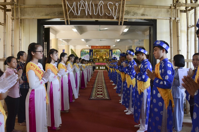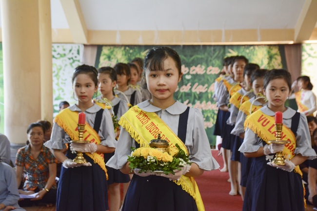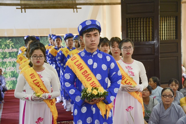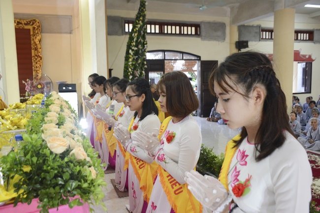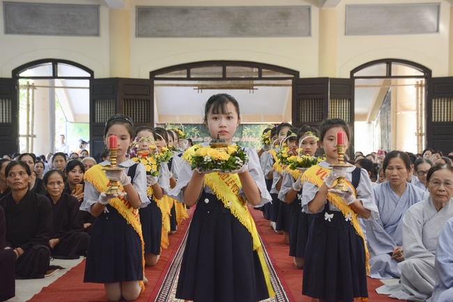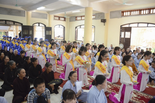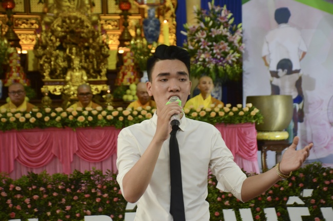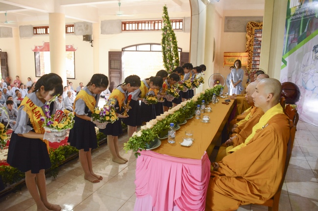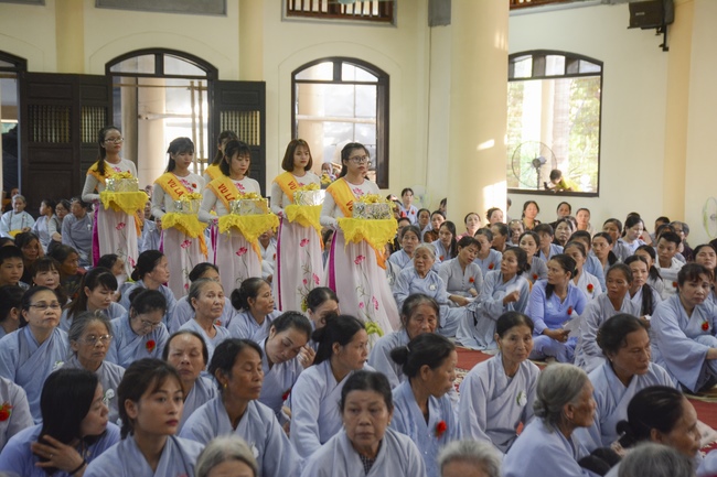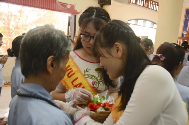 During the ceremony, on behalf of the mass, the Buddhist children of Tay Khanh Pagoda celebrated the ceremony of offering flowers to the ten directions of three Jewels and the monks of the Sangha. The ceremony’s important, moved section is the ceremony of pinning roses for parents in their deep emotion. Thanks to the blessings of the ten directions of Buddha, the testimony of the Buddhist monks, the mass celebrated the ceremony of giving repentance to their parents. After the repentance, on behalf of all, the teenaged Buddhists of Tay Khanh Pagoda honorably offered alms to the venerables.