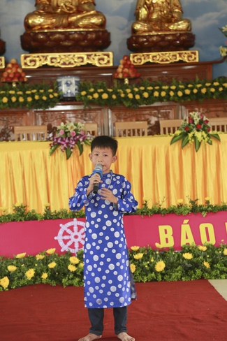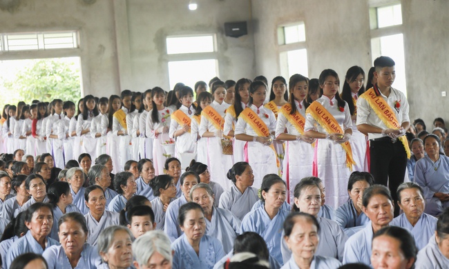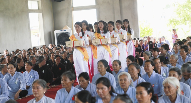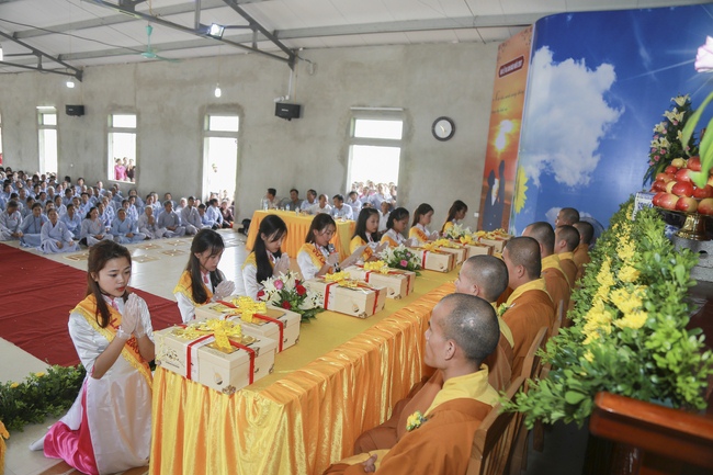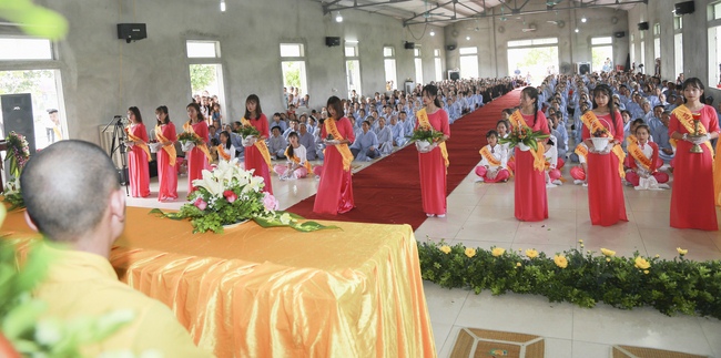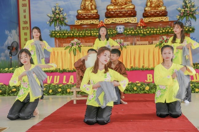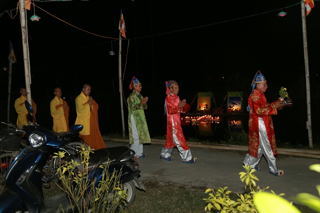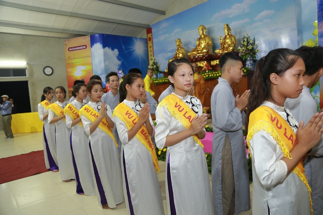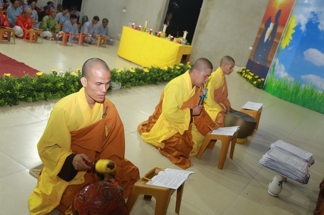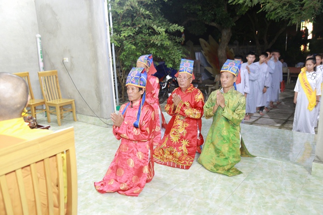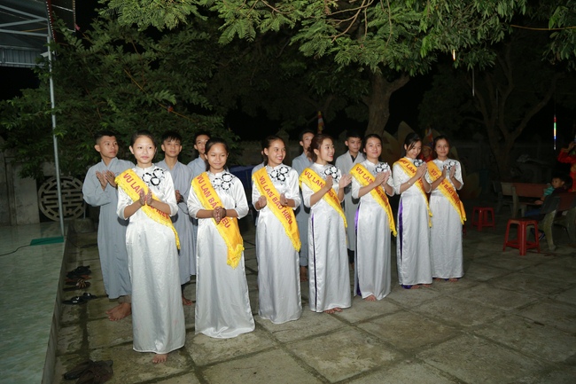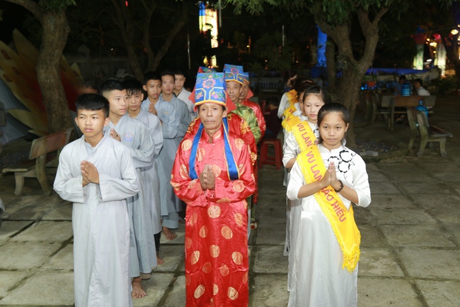 After declaring the reason, introducing guests and young Buddhist children of Dong Cao, on behalf of all mandala, the young Buddhists of Dong Cao Pagoda offered six parts of offering to ten directions of Triratna and current Venerables to create good conditions in the great Ullambana.