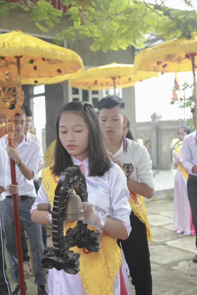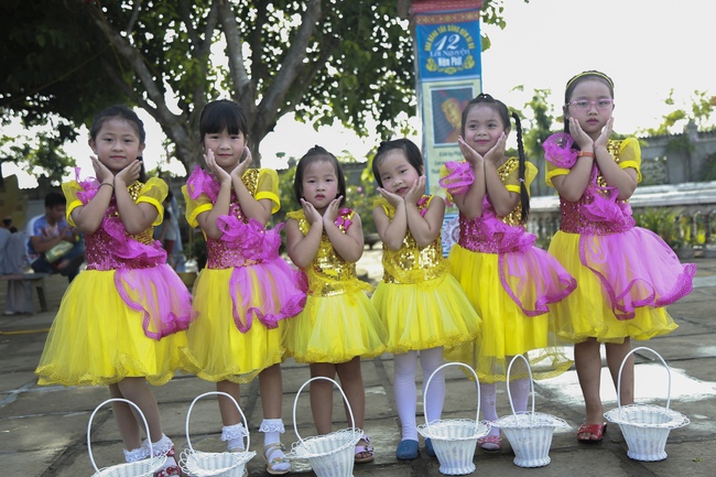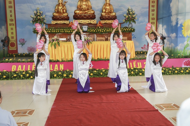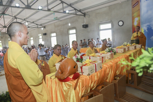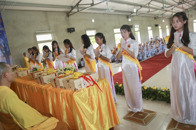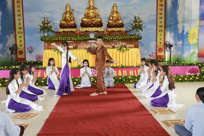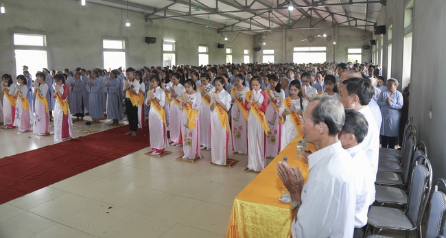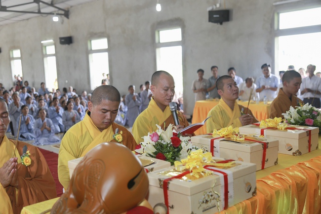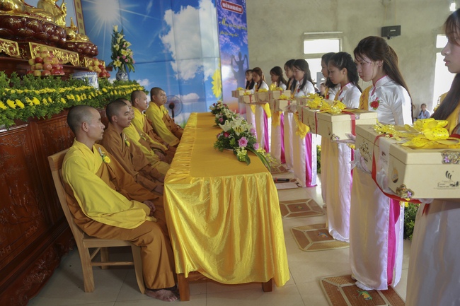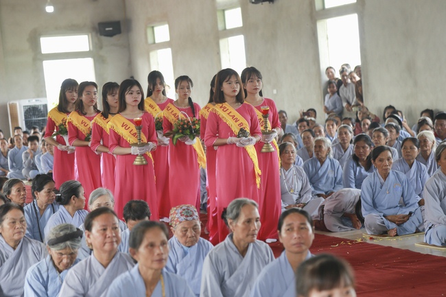 After declaring the reason, introducing guests and young Buddhist children of Dong Cao, on behalf of all mandala, the young Buddhists of Dong Cao Pagoda offered six parts of offering to ten directions of Triratna and current Venerables to create good conditions in the great Ullambana.