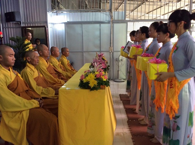 Preaching dharma to the ceremony, on behalf of monks, Junior Ven. Thich Tam Dao praised the Buddhists’ pious mind and accepted giving alms. He mentioned the duties of children that they should well practice the word of “piousâ€â€™; therefore, this action will deserve the parents’ noble love for us. Besides that, not only repaying to parents as of serving and taking care them, we must encourage and advice our dad and mum that they should refuge on Triratna to have happiness at present and in the future as well.