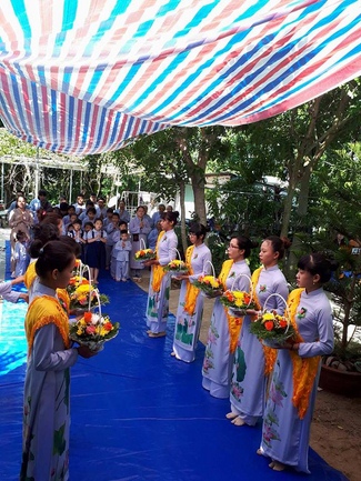 The ceremony officially began at 8 A.M. First, it was the section of flower offering which was performed by the young of Buddhist families. Next, it was the rite of rose flower pinning, one of the rites that could not be lack of the ceremony. All of mandala listened to Buddhist Thuyen Thuyen who read the significance of rose pinning. Thank to the support of ten-direction Buddhas, before the witness of the Venerable, the mass led to Triratna which worshiped and showed their parents’ ten great gratitude.