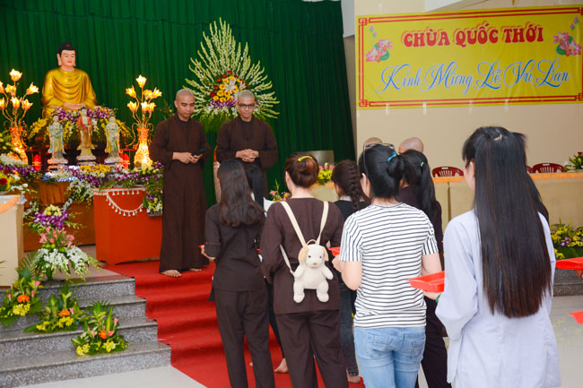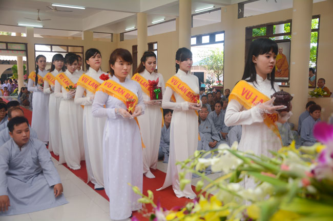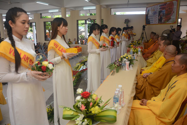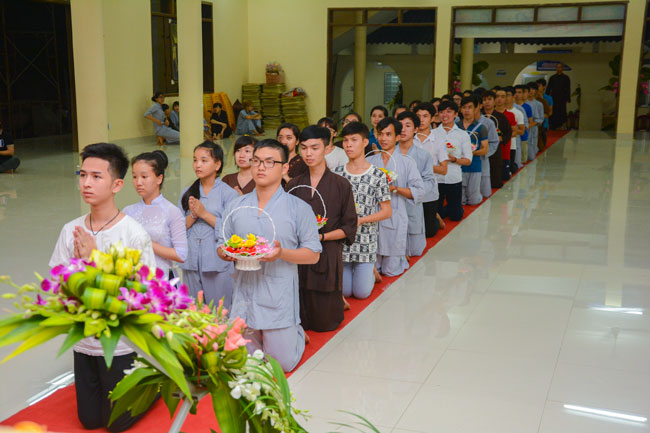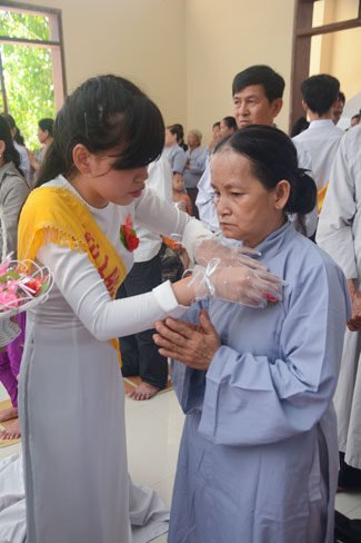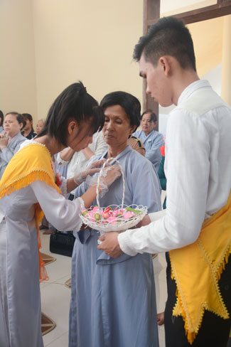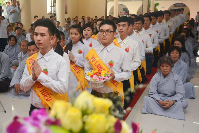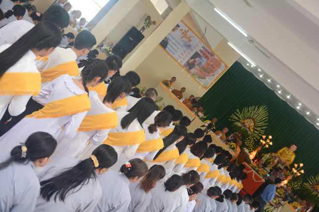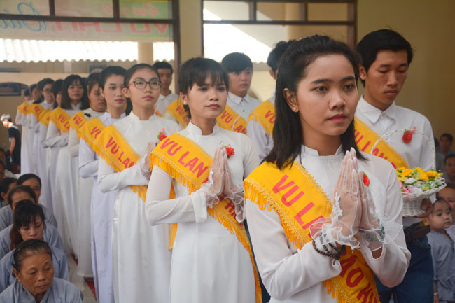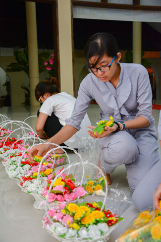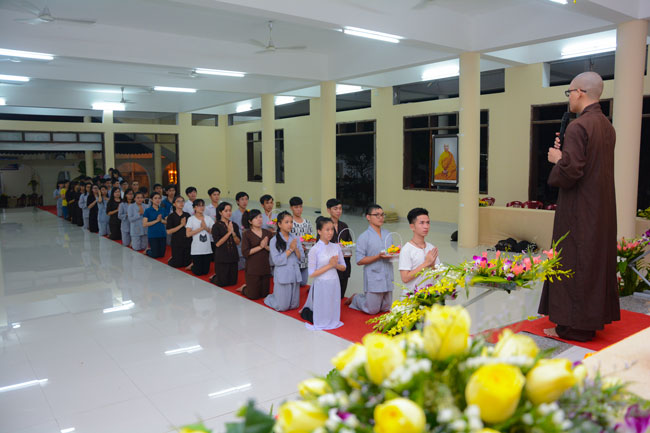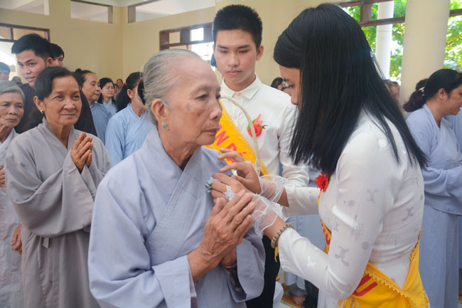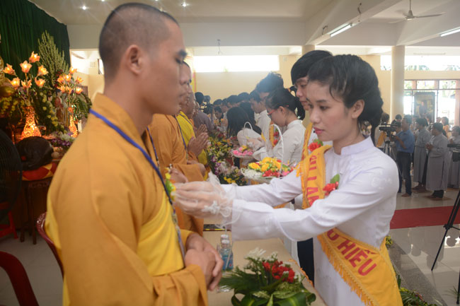 Following the filial piety example of Venerable Moggallana, after pinning of red flowers, the Buddhist teenagers of Quốc Thới Pagoda granted offerings to the honored monks. The Most Venerable Thich Giac Huong who was the witness of the Administrative Board of the Vietnamese Buddhist Congregation of Cho Lach District, represented all Sangha and had some teachings in the ceremony. After his speech, all the mass believed and obeyed in the Most Venerable ‘s Dharma words to become filial piety people who repay their parents’ merit when they still exist in this life.