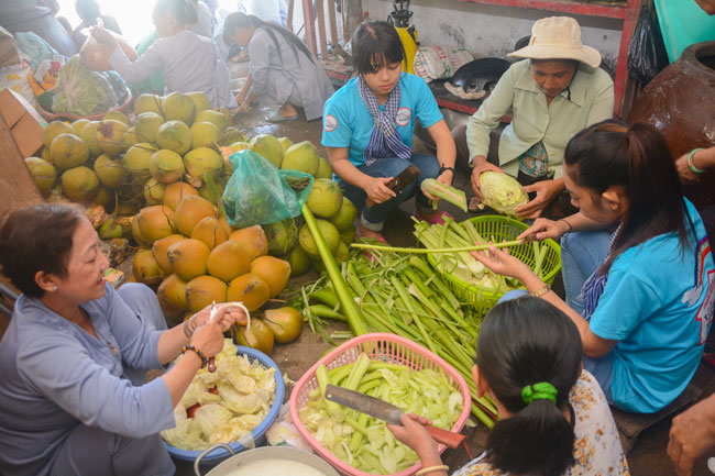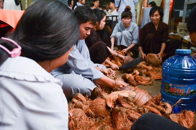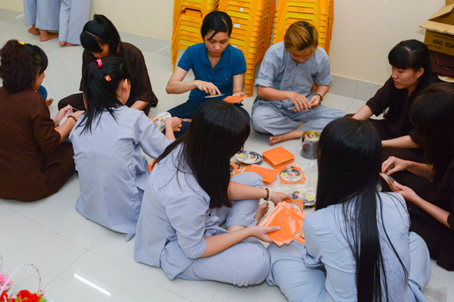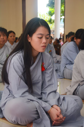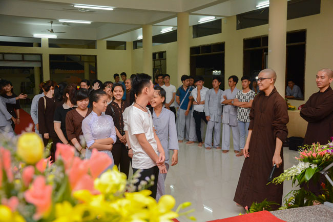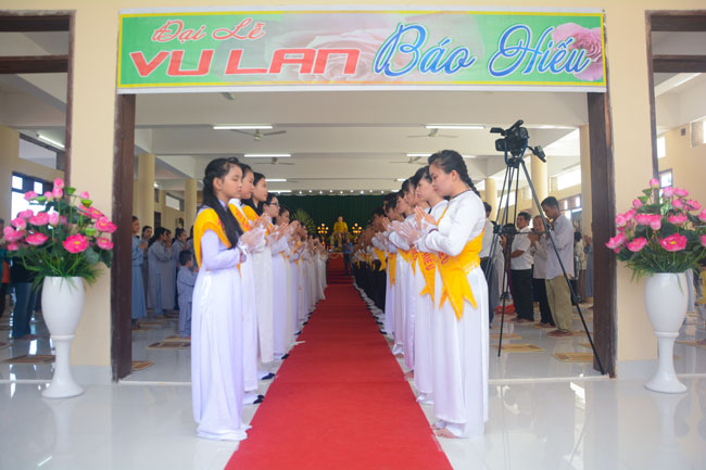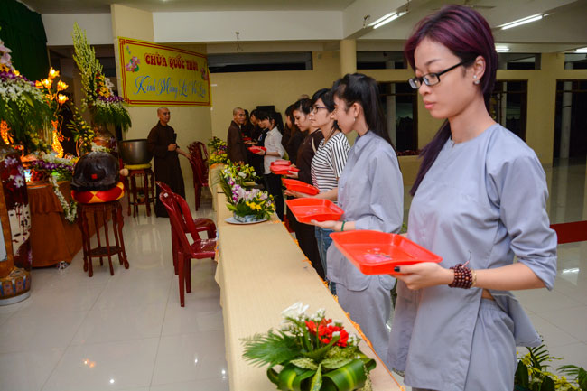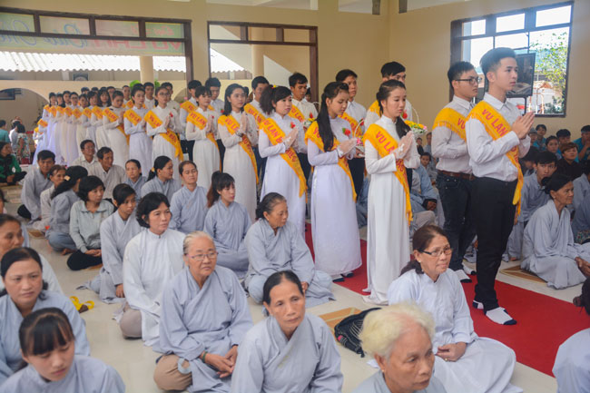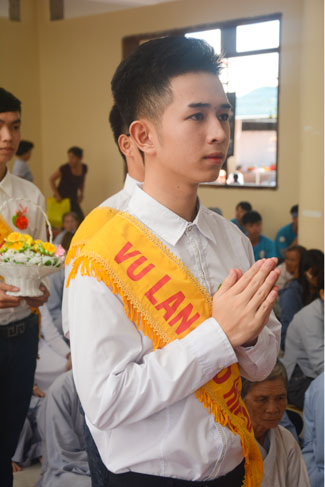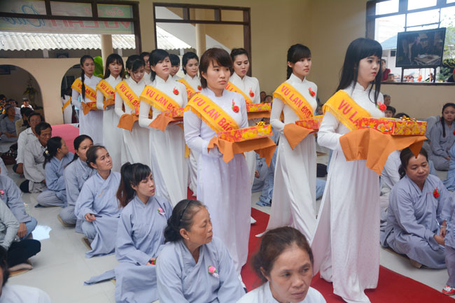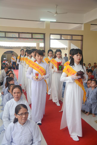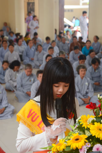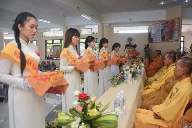 Following the filial piety example of Venerable Moggallana, after pinning of red flowers, the Buddhist teenagers of Quốc Thới Pagoda granted offerings to the honored monks. The Most Venerable Thich Giac Huong who was the witness of the Administrative Board of the Vietnamese Buddhist Congregation of Cho Lach District, represented all Sangha and had some teachings in the ceremony. After his speech, all the mass believed and obeyed in the Most Venerable ‘s Dharma words to become filial piety people who repay their parents’ merit when they still exist in this life.