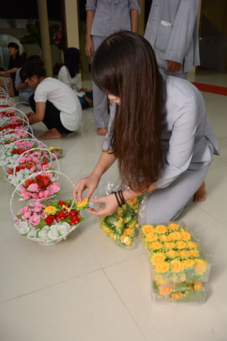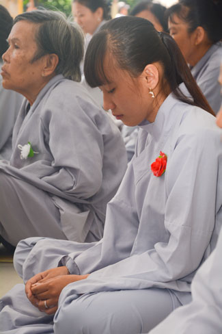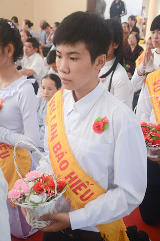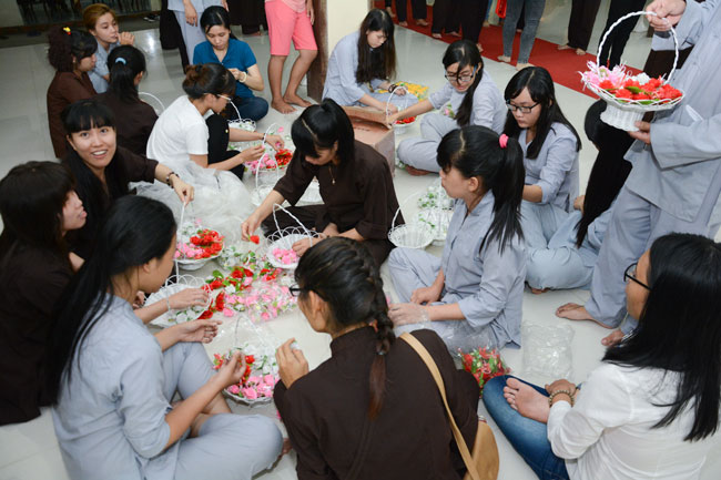 After to introducing of the ceremony was the ritual of making offers to the Buddha by the Quoc Thoi pagoda‘s Buddhist families. Next, the mass were filled with various emotions about their parental love when listening to the meaning of pinning red roses on the shirt along with the melody of “Long Me†song. Then, the white or red roses were pinned on the shirts of the children who were toward their minds to their parents.Although the roses were white or red, how significative it was! because it warmed completely up the parents‘ love saving for all of us. Therefore, we shouldpin flowers and vow the best things to our parents.
