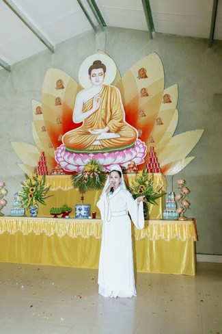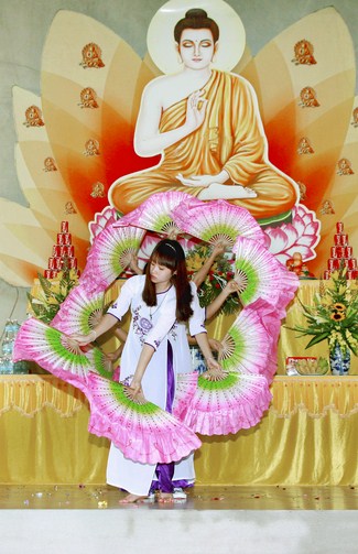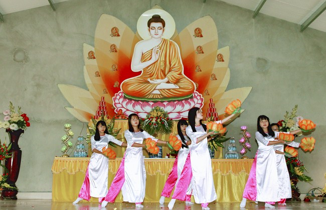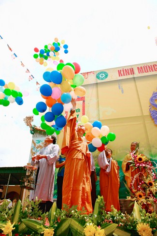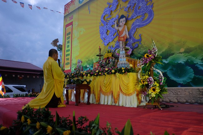 At 9 o’clock sharp, official celebration program took place. Venerable Thich Nguyen, on behalf of the monks present, proclaimed Encyclical Happy Vesak's message from the Head of Emeritus Committee - Viet Nam Buddhists to Bhikkhus, Bhikkhunis, Lay Buddhists. Next, nuns Thich Nu Thanh Thuy read the meaning Vesak. After that was the Drama of the Venerable Thich Tam Hung, Cao Dong Temple’s abbot. Ending the ceremony, Buddhist gathered on the stage and performed washing a Buddha rituals and released bubbles to pray for world peace.