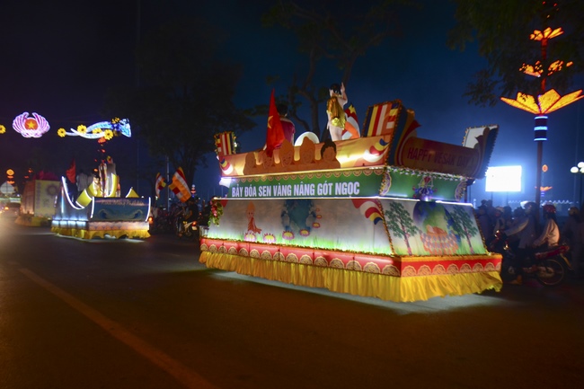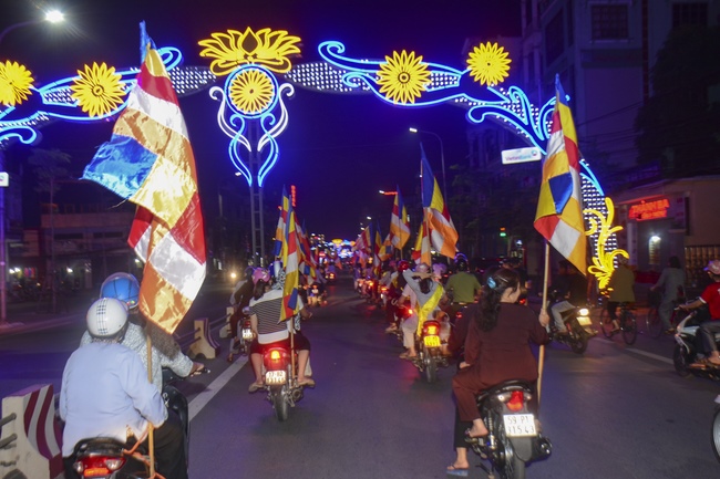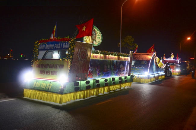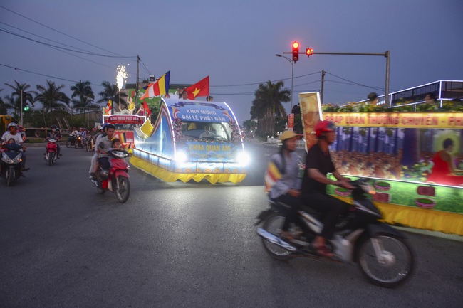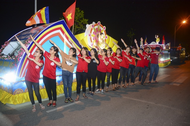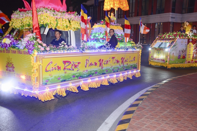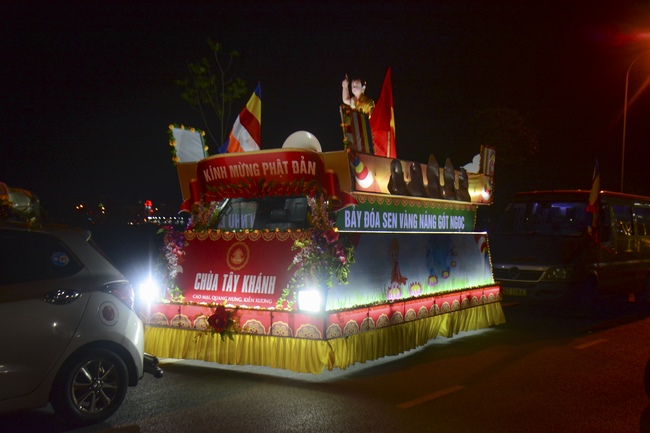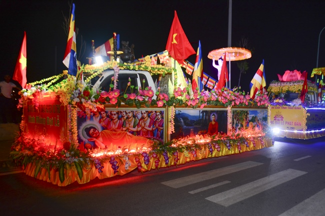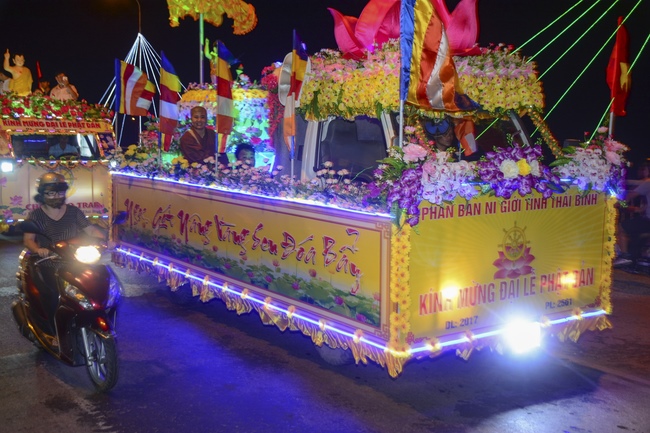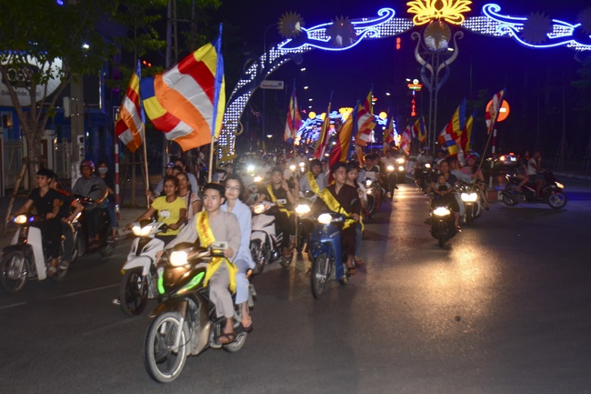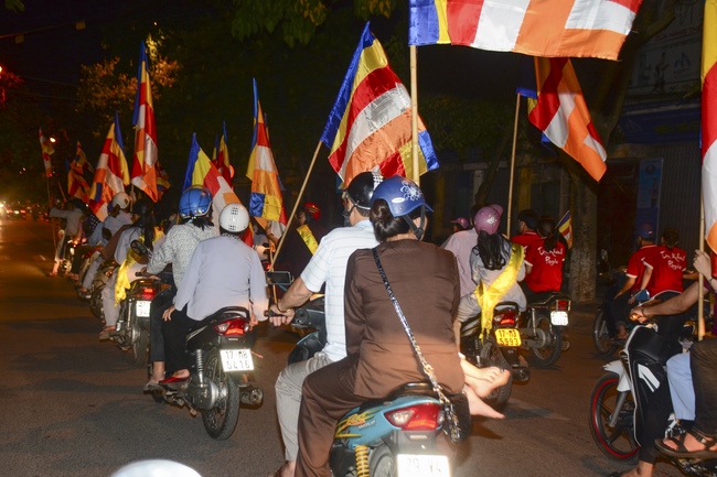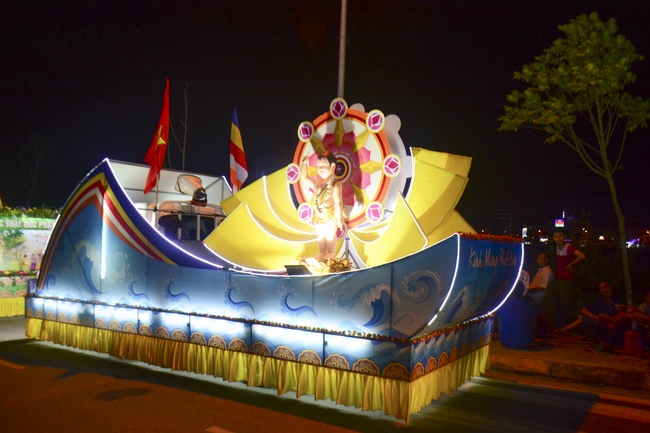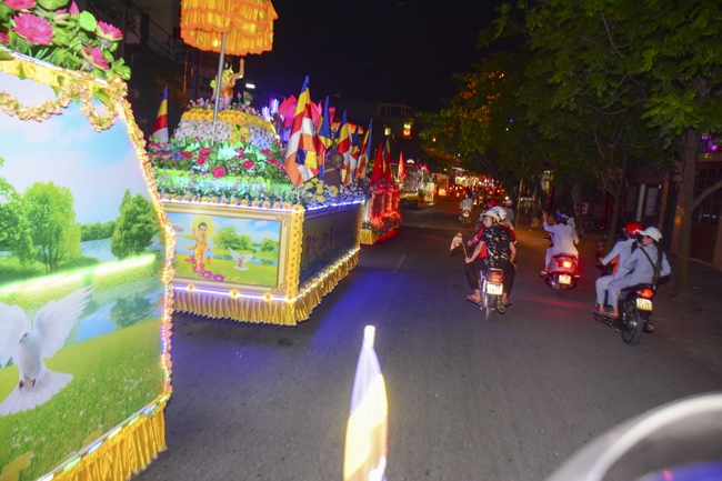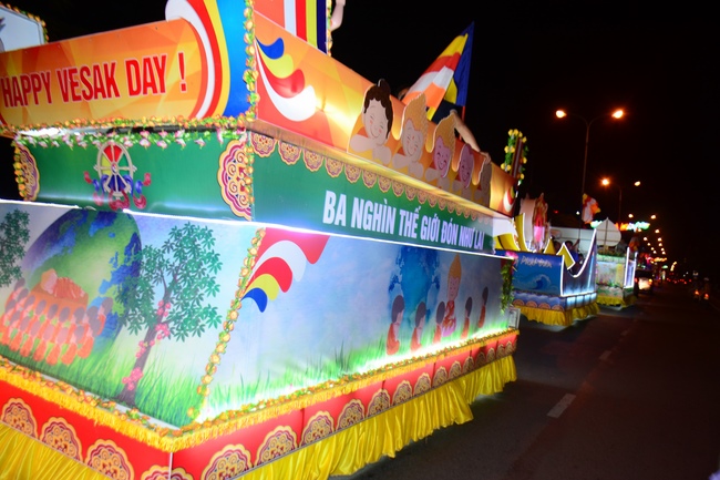 The monks and Buddhists on trucks and motorbikes decorated beautifully and elaborately for Vesak day were so excited to celebrate the birthday of Buddha at night.