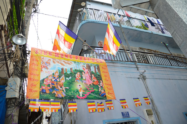 At 11:30 a.m, the group had lunch at the Buddhist’s home.\r\nThe venerable were very happy when witnessing this Buddhist’s family\r\nenthusiastically responded to welcome the Vesak Day as the master’s instruction\r\n“All welcome the Tathagata; households greet Vesakâ€. A portray picture of the\r\nBuddha was born in Lumbini, and a flag and gonfalon were hung in the front the house.\r\nMrs. Minh, who 80 years old was also hanging a flag at the front porch.