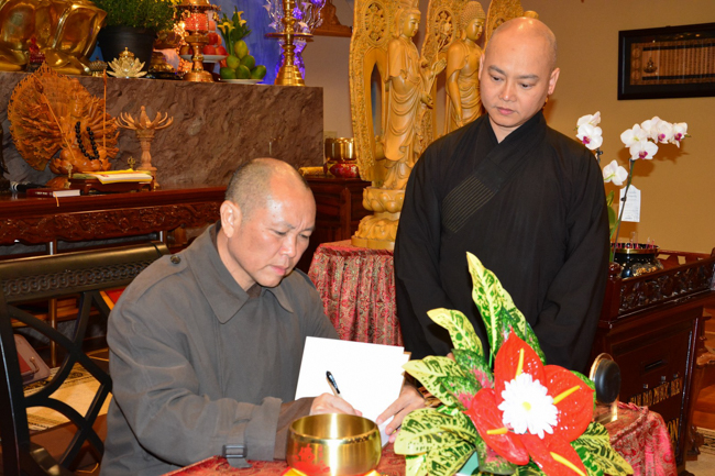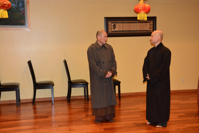 Sen. Ven. Thich Chan Tinh delivered Dharma gifts to the Abbot and Buddhists at the meeting.