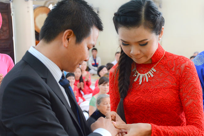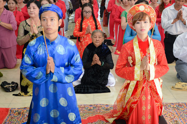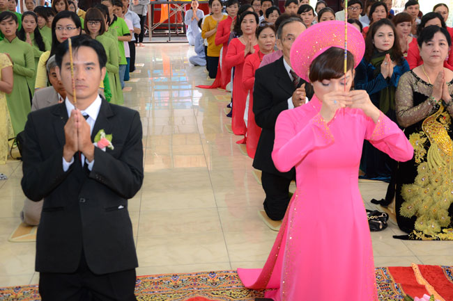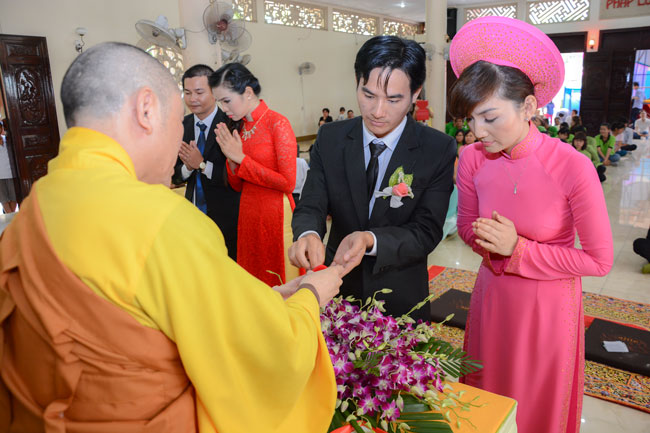 After finishing the incense ritual, the families\r\nrepresentatives honored to the monks to ask them for their witness to the\r\nwedding. After that, the grooms and the brides headed toward the Buddha and\r\nbowed Him to pay homage. Then, it was the ritual showing thanks to their\r\nparents and finally was the one for the groom and the bride to show their\r\nrespect to each other. At the end, they exchanged wedding rings under the proof\r\nof the Venerable.