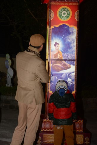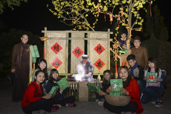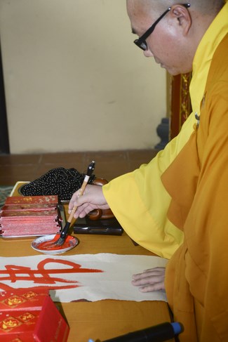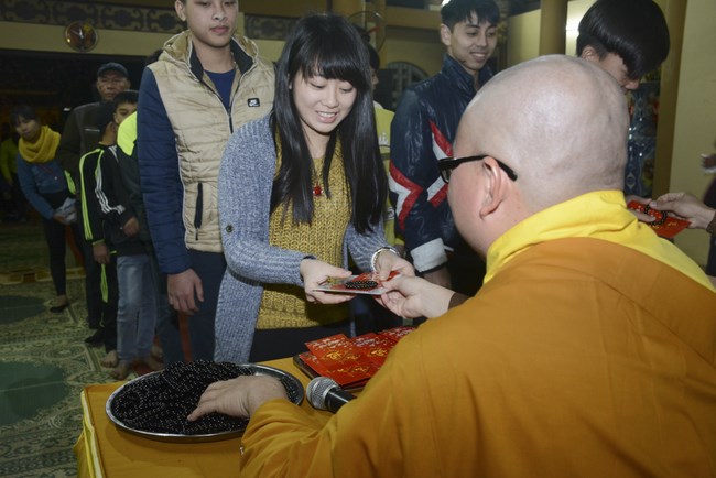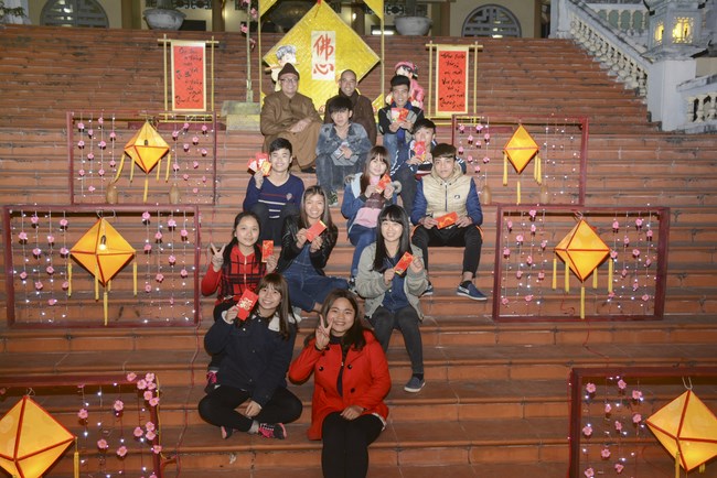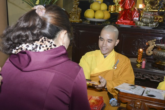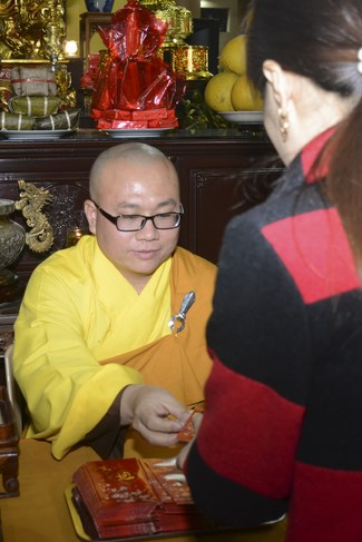 After Tet greetings, monks gave to Buddha some lucky money of the begining days in New Year and a DVD "A Dharma Trip."
