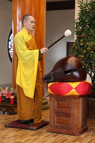 At 9 o"clock, it was the welcome ceremony to the clergy delegation. Started with the offering ritual and a chanting session to wish for peace. The mass chanted harmoniously, praying for a peaceful year; wishing more people will be enlightened to Three Jewels, to practice Buddha"s teachings in order to have a happy life in a peaceful world.