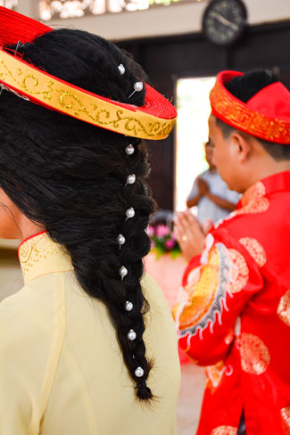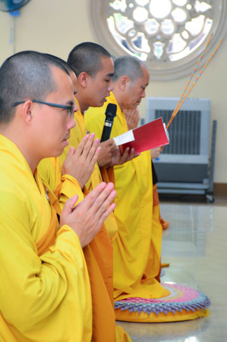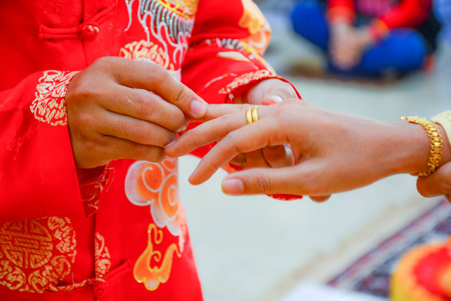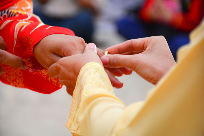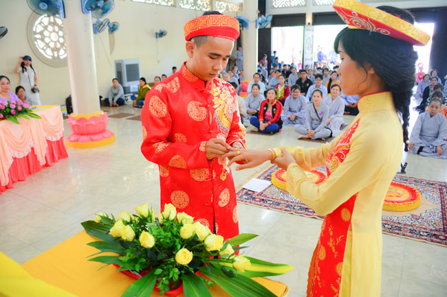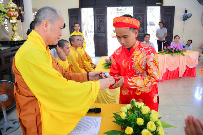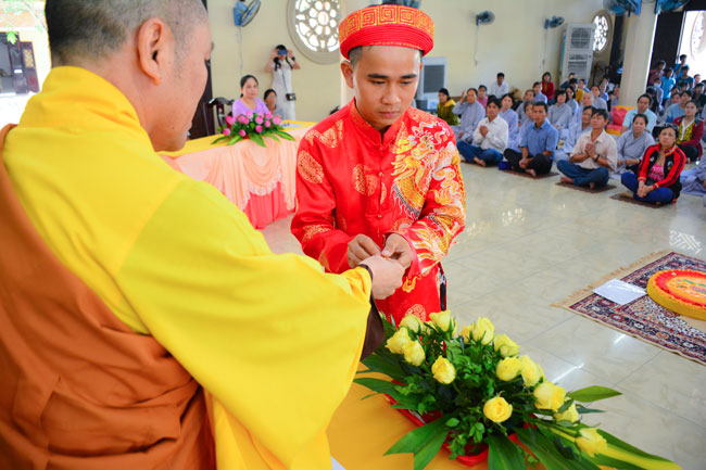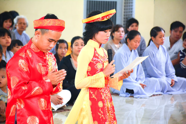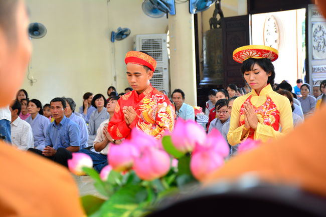 Besides, husband and wife must know to show filial piety toward your parents, to care and teach your children in order to follow your traditional families. To be a buddhist, after taking refuge in the Triratna, a couple had to keep five precepts, because it was the basic foundation morals for people. Members in your family needed also to inquire into Buddha's teaching, apply it to daily life in order to have bliss and happiness. With traditional rites such as ceremony of thanks to the Triratna and parents, handing wedding ring, vowing from bride and bridegroom, etc. The ceremony had left deep impressions and would be a commemorate hard to forget to young couple. The life of wedded pair in future could not avoid difficulties, led to bump against and misunderstood to each other. This stamp would help two of you looking back yourselves, remembering the instruction of all monks in order to continue the itinerary in "maintain a fire" in such a way as to set your family at a warm and happiness.