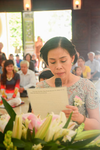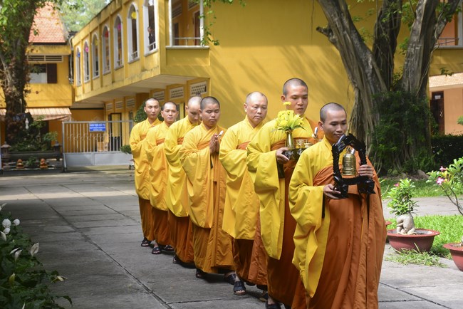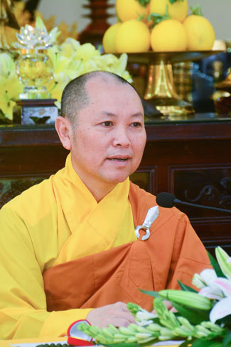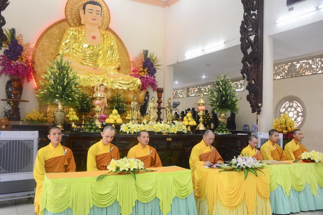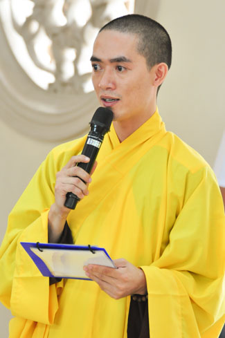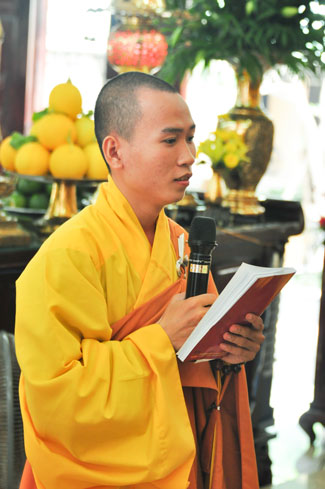 After going through the rites of a usual ceremony such as offering incense to the Great Fame, representing two families to exchange wedding rings, etc. on behalf of the present monks, Senior Venerable Thich Chan Tinh, the Abbot of Hoang Phap monastery, proved the reception and delivered noble words concerning spousal life for the young couple.