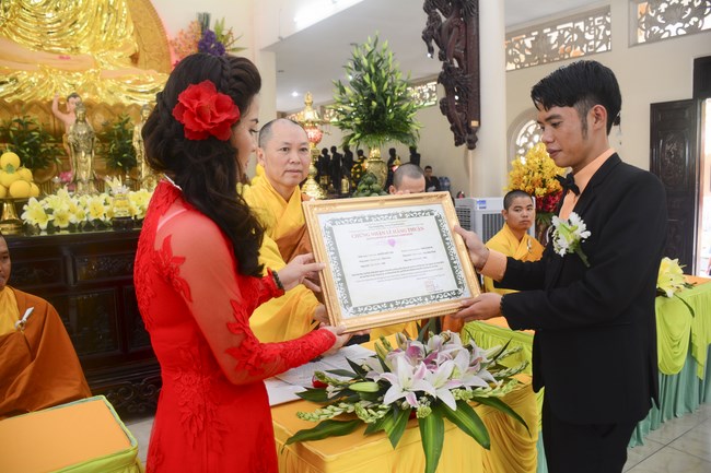 Then, the Venerable awarded certificates of Hang Thuan and gifts to young couple.