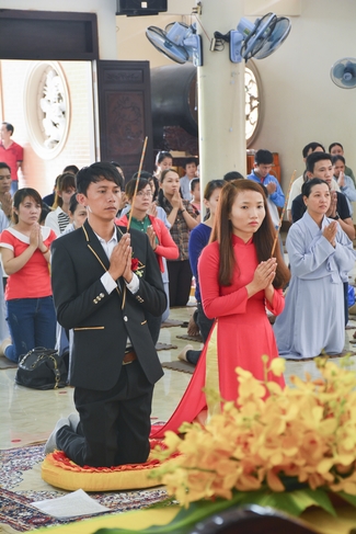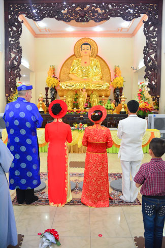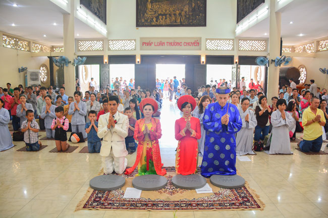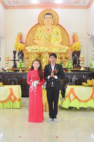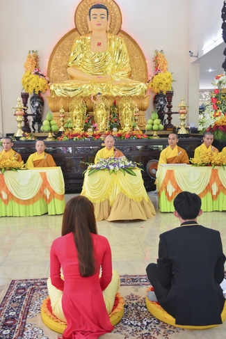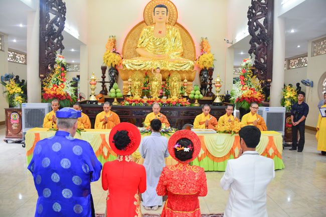 To a Buddhist, it is a holy happiness to be hold awedding ceremony at pagoda. Within the witness of Triratna and two families, the couples of bridegroom and bride took an oath living their whole life together, keeping the moral rules as Buddha’s teaching.