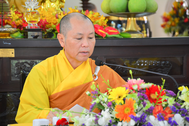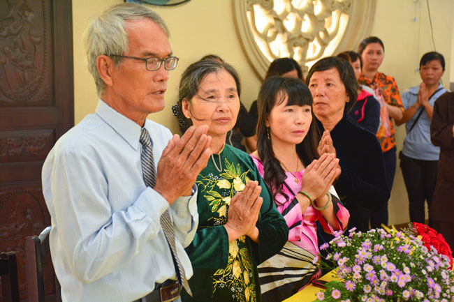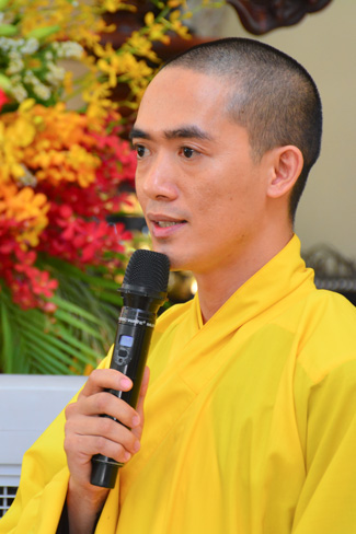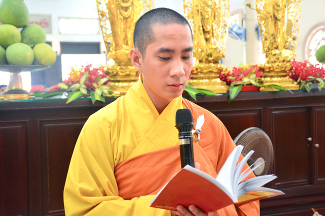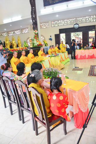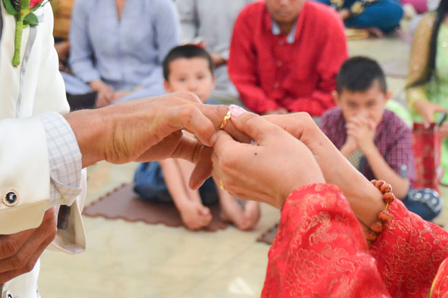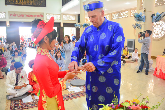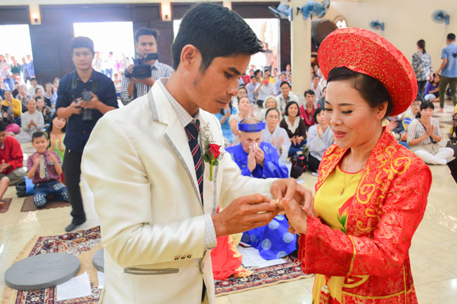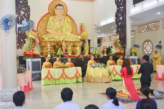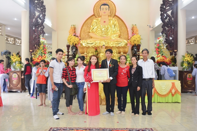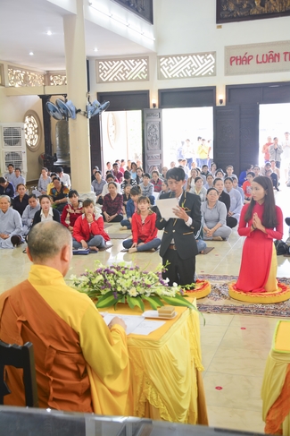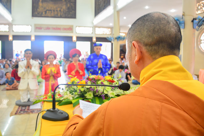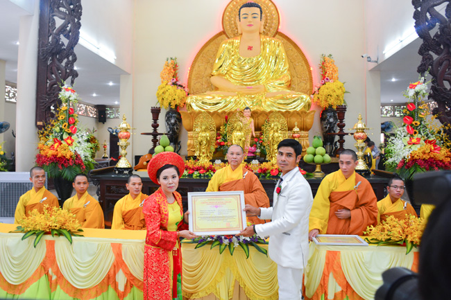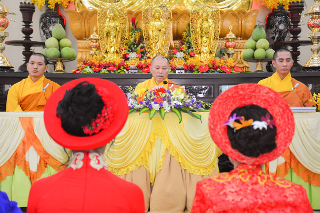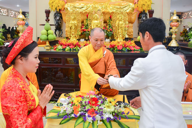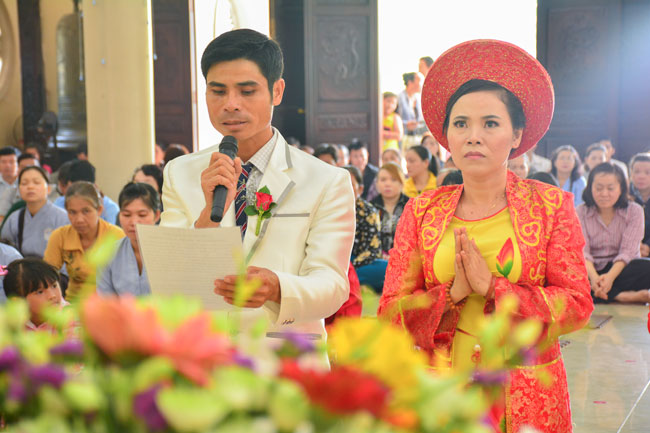 After performing the ceremony rites such as burning incense to Buddha, representatives of two families gave a proclamative talk and put on ringsto each other.On behalf of all the monks, Senior Venerable Thich Chan Tinh, abbot of Hoang Phap pagoda, witnessed as well as gave husband-wife ethical teaching to the young couples.