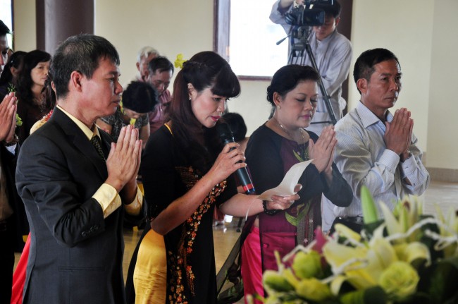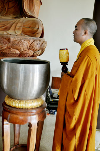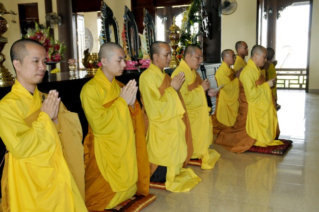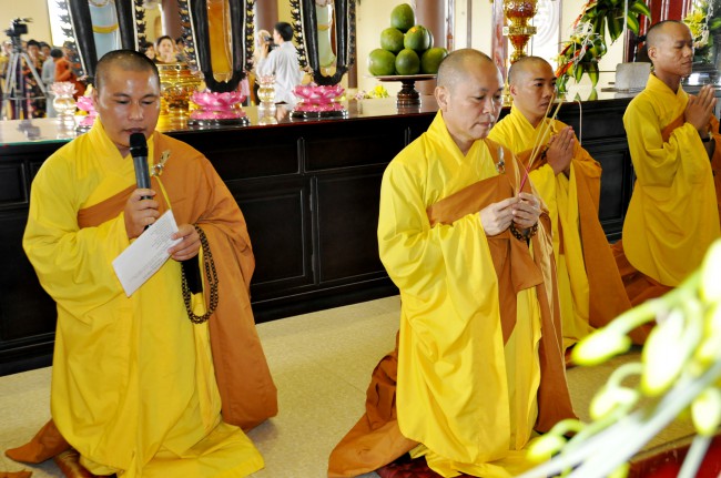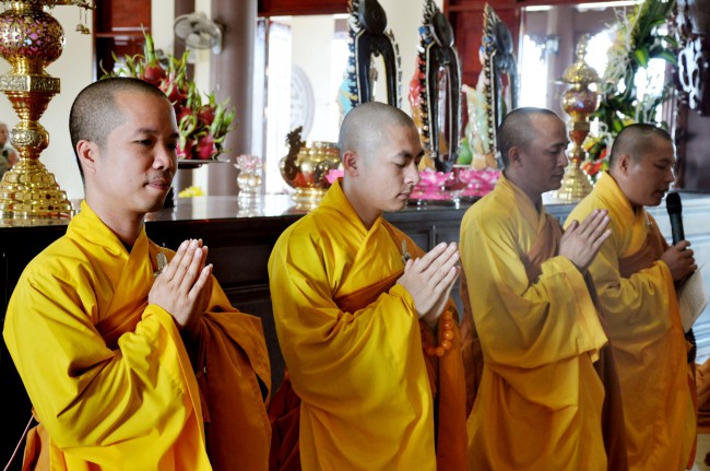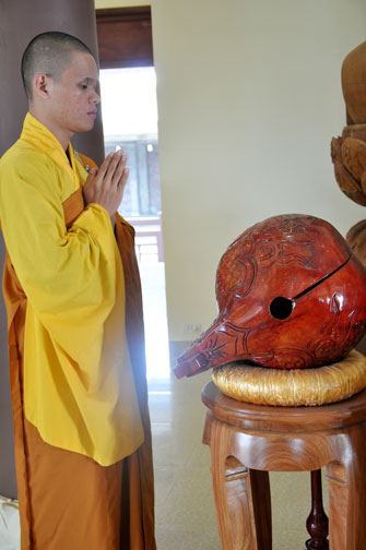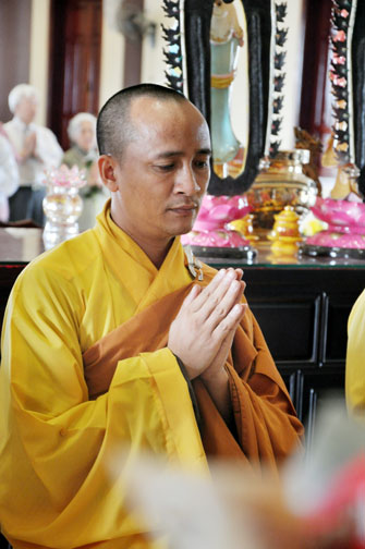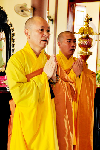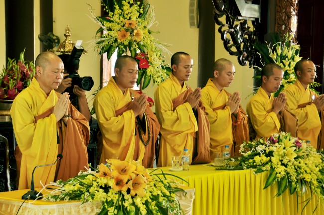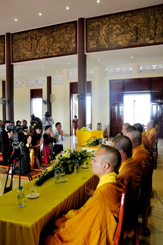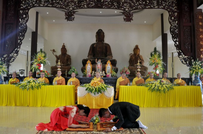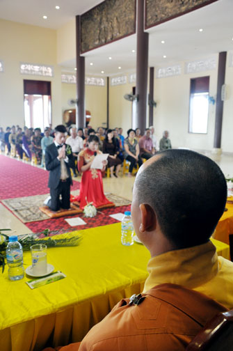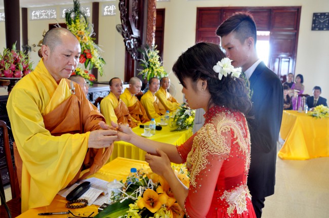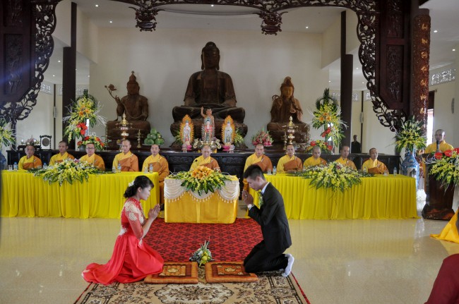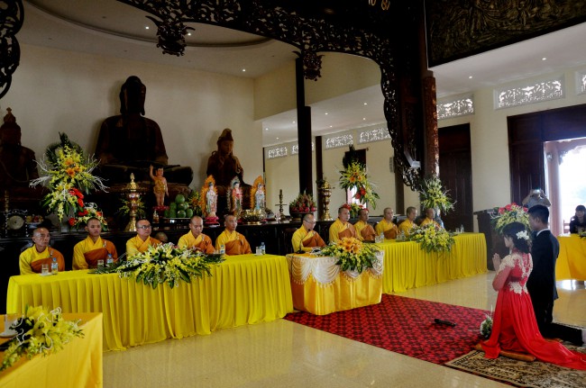 At 09:00 am, the bride and groom welcomed the honored monks\r\nwho came to the Great Hero Hall for the ceremony witness. After offering\r\nincense and praying the Buddha, the families representatives honored to the\r\nmonks to ask them for their witness to the wedding. On behalf of the Venerable,\r\nVenerable Thich Chan Tinh responded to the requests of two families.