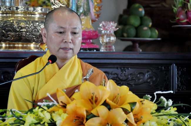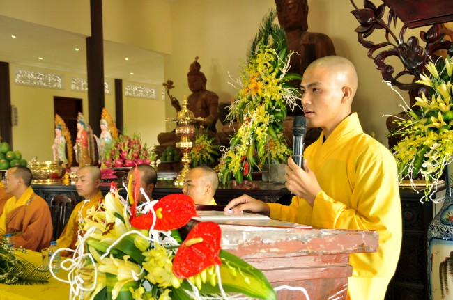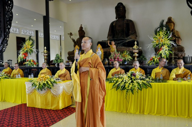 Subsequently, Sen. Ven Thich Chan Tinh had some instruction\r\nto these young couples in this great day. First, Ven. praised\r\nthe spirit of the two families who came to the pagoda to celebrate Wedding\r\nCeremony and made good conditions for the bride and groom. From the definition\r\nof Wedding Ceremony, the Venerable showed the bride, groom and everybody that\r\nthose who want to have true and eternal happiness they need to have a proper\r\nunderstanding in our behavior. In order to get it, Six Harmonies - six Dharmas about\r\nharmony and respect, we have to do completely.