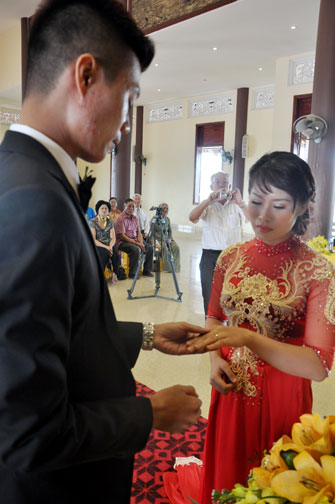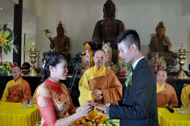 One of the most important pledging things in this\r\ngreat day is the wedding ring. During the ceremony, the Venerable gave a speech\r\nabout the meaning of ring. Although they are just engaging things,\r\nthey have a great value in the couples life in the present as well as in the\r\nfuture. With such a worthwhile meaning, in front of the witness of Venerable,\r\nmonks and two families, the bride and groom exchanged wedding rings each other\r\nand officially become husband and wife. Before giving this important promise,\r\nthe bride and groom stood in front of two families and read their vow to build\r\nhappy family based on the teachings of the Buddha in Sigalovada sutta.