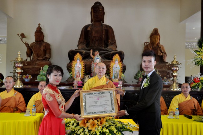At the end of the ceremony, Venerable presented\r\nsouvenirs and a marriage certificate for the bride and groom.