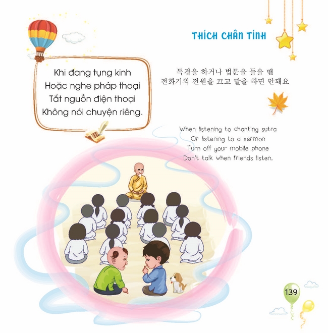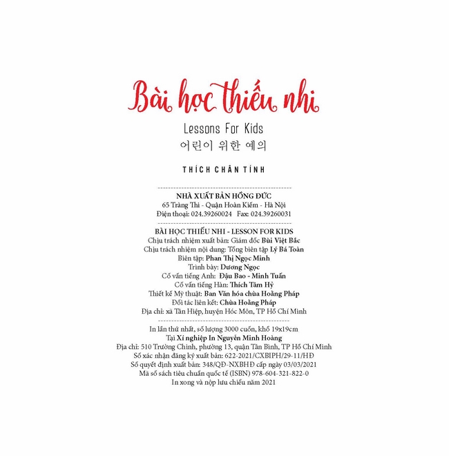 Ấn Phẩm Chùa Hoằng Pháp Bài học thiếu nhi Tác giả: Thích Chân Tính Mục lục Khi bé thức dậy Bé biết giữ vệ sinh cá nhân Bé học phép tắc khi ăn uống Bé học làm người lịch sự, có ý thức Bé lễ phép Bé là người hòa nhã Bé vâng lời Bé siêng năng làm việc nhà Bé chăm học Bé giữ gìn sức khỏe Bé tôn trọng, giúp đỡ mọi người Bé biết thế nào là nguy hiểm Em về bên Phật Xem thêm Em về bên Phật Facebook Google Tweet Sách cùng thể loại Vua Pasenadi Chùa Hoằng Pháp Lời Phật dạy trong kinh A Hàm - Tập I Chùa Hoằng Pháp Hoa Tâm Bừng Nở Nhiều tác giả Tặng phẩm xuân 2025 Thích Chân Tính Tặng Phẩm Xuân 2024 Thích Chân Tính Giới thiệu ấn phẩm mới: Lịch bàn 2023 Thích Chân Tính Xem tất cả