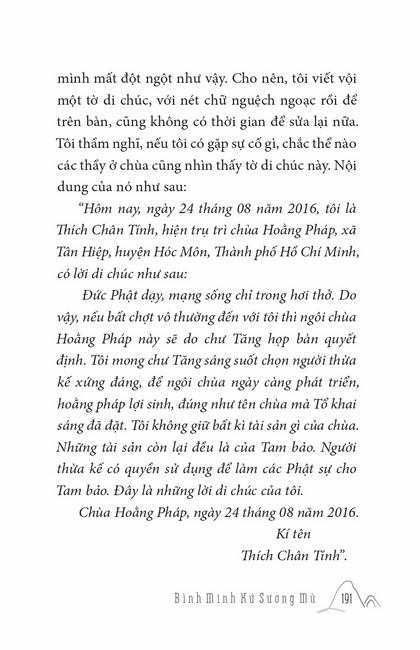 Sách HT. Thích Chân Tính Bình Minh Xứ Sương Mù Tác giả: Thích Chân Tính Mục lục Lời tựa Bình Minh Xứ Sương Mù Chính Đạo Cao Nguyên Thánh Địa Dấu Ấn Hoằng Pháp Tại Mĩ Đường Về Cội Giác Hoằng Pháp Tại New Zealand Và Úc Kể Chuyện Hoằng Pháp Tại Mĩ Sắc Hoa Miền Bắc Tổn Thất Nơi Kết Nối Tin Yêu Pháp Thoại Ở Toronto Mong Ước Đời Người Vì Pháp Quên Bệnh Vững Tiến Mấy lời tâm huyết Xem thêm Kể Chuyện Hoằng Pháp Tại Mĩ Facebook Google Tweet Xem tiếp Sách cùng thể loại Tết Nguyên Đán ở Việt Nam Thích Chân Tính Nhìn lại Thích Chân Tính Lời Nhắn Nhủ Thích Chân Tính Tịnh Độ Nhân Gian Thích Chân Tính Dân Hòa Nước Mạnh Thích Chân Tính Ở Đời Vui Đạo Thích Chân Tính Xem tất cả