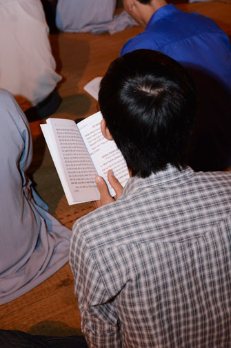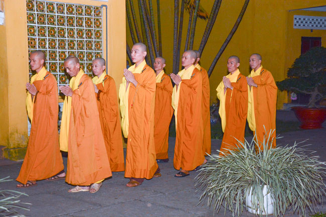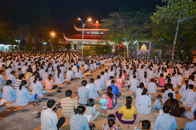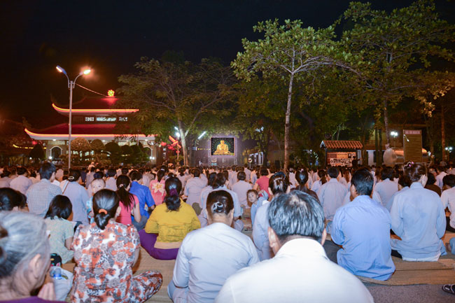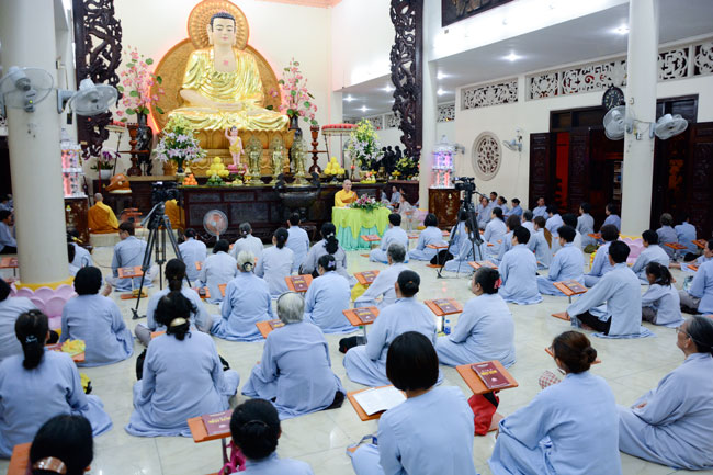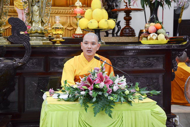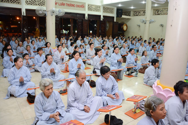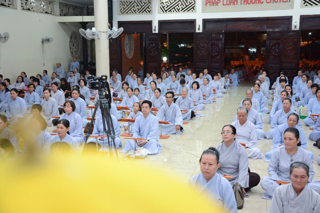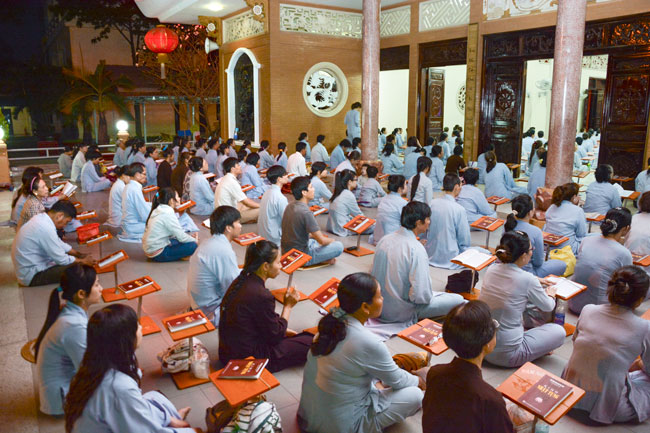 18h, sau khi ổn định trang nghiêm đạo tràng, thiện nam tín nữ Phật tử cùng lắng lòng nghe thầy Thích Tâm Hồng, Tăng chúng chùa Hoằng Pháp giảng về chủ đề “khắc phục khiếm khuyết”.