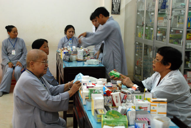 Về khâu y tế, có một số bác sĩ phát tâm ở lại chùa khám và chữa bệnh cho các Phật tử. Có sức khỏe tốt thì sự tu tập mới đạt hiệu quả. Ý thức được điều đó, các cô các bác ở phòng y tế luôn sẵn sàng phục vụ và hướng dẫn tận tâm cho những Phật tử đến khám và chữa bệnh.