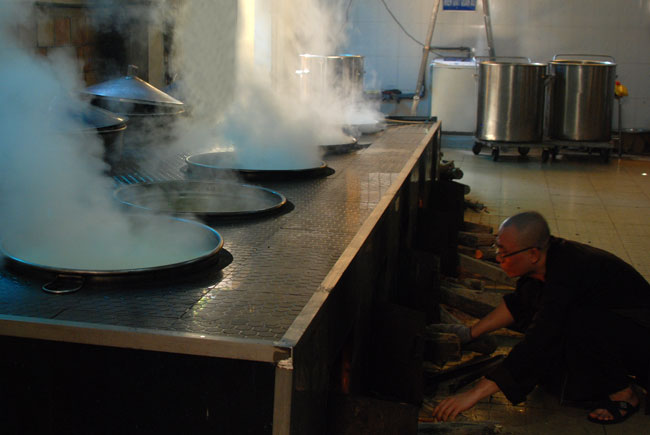 Được biết, quý Thầy và Phật tử phục vụ ở bộ phận nhà bếp phải chia nhau làm việc suốt 24/24 để phục vụ nhu cầu ăn uống của đại chúng. Công việc tuy mệt nhọc, nhưng với tinh thần phụng sự chúng sinh là thiết thực cúng dường chư Phật, chư Tăng cùng Phật tử đã làm việc trong hoan hỷ và an lạc. Họ là những người tiếp sức cho hành giả an tâm trong quá trình tu tập của mình.