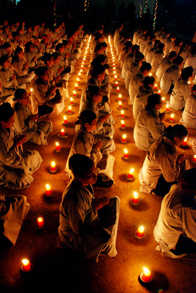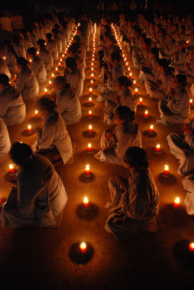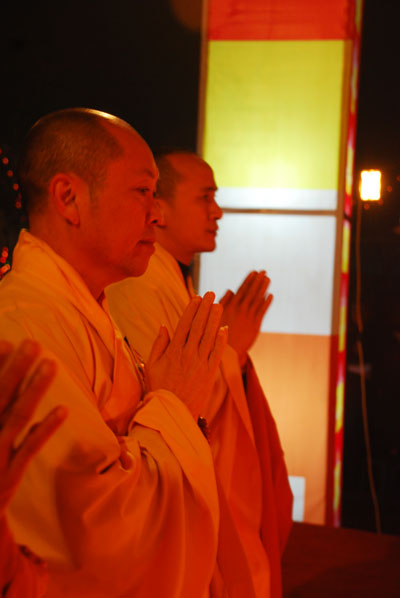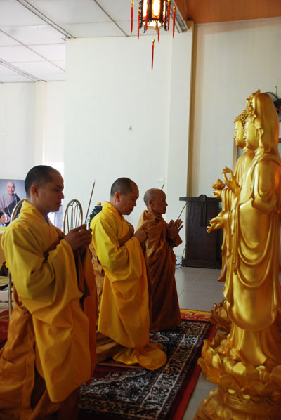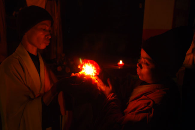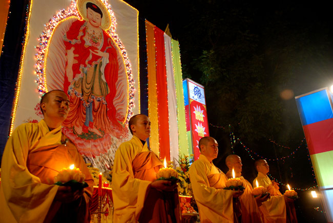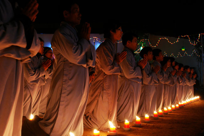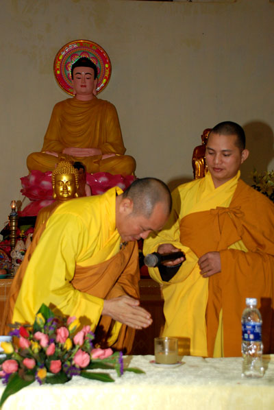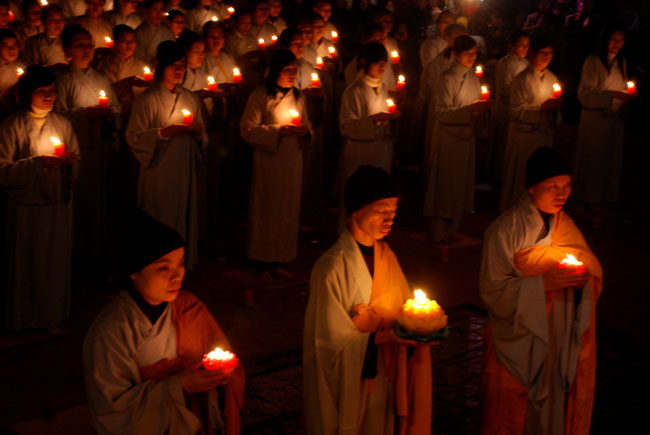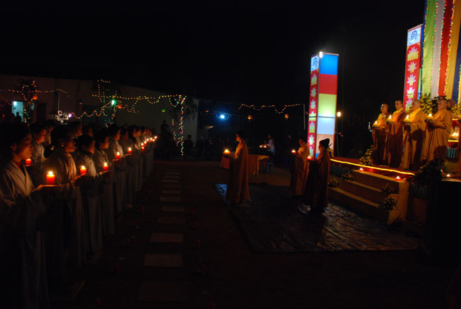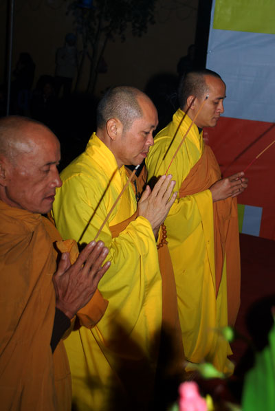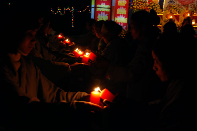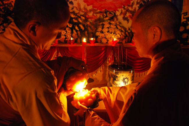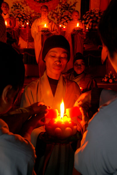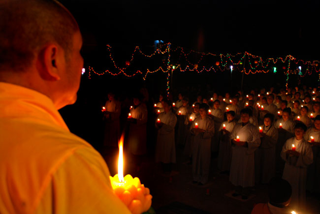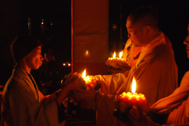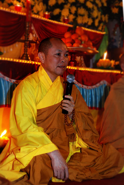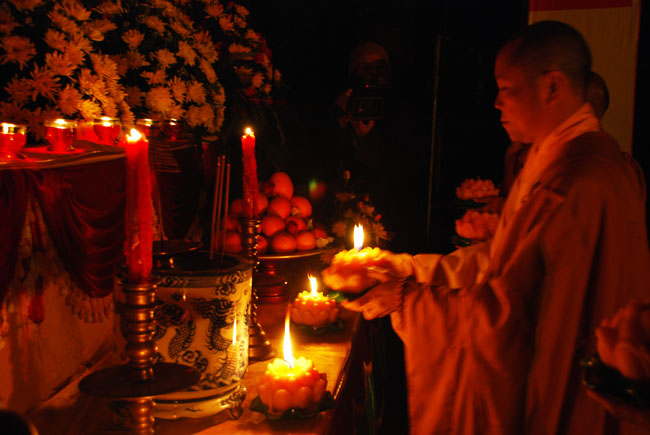 Thượng tọa Thích Chân Tính mồi nến từ bàn thờ Phật