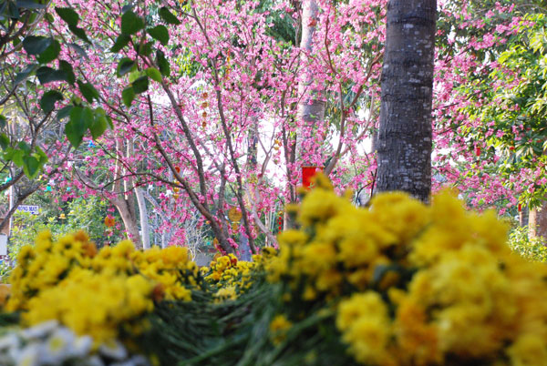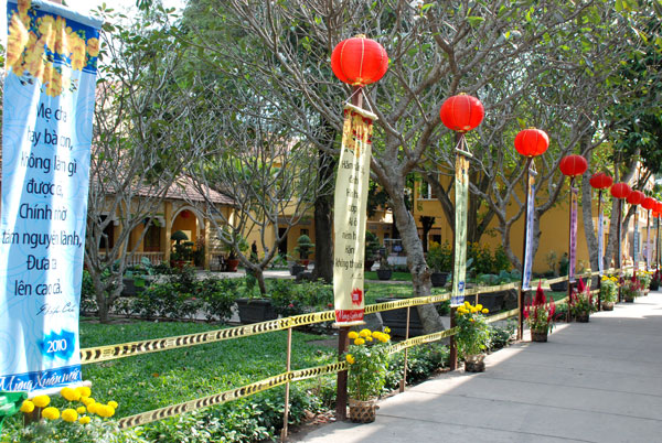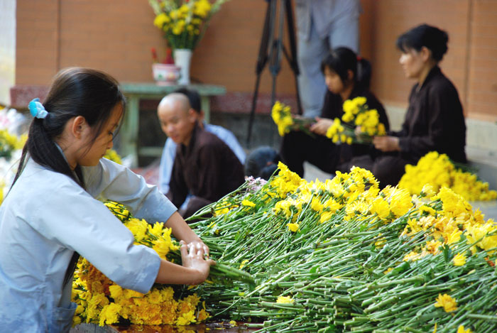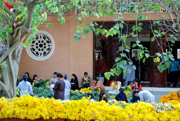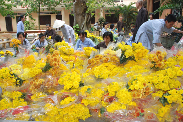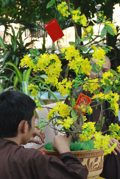 Hòa trong niềm vui dân tộc, những ngày cuối năm, quý thầy chùa Hoằng Pháp cũng rất bận rộn chuẩn bị chào đón năm mới. Đến chùa, ai cũng thấy một không gian khác hẳn ngày thường với đèn hoa trang trí xung quanh chùa. Những cành hoa đào, hoa mai khoe sắc rực rỡ. Hoa xuân được chở về tô điểm cho không khí xuân thêm ấm áp và đầy sắc màu. Các bồn hoa, cây cảnh của chùa cũng sáng ngời màu vôi mới. Sân chùa đầy hoa và nắng.