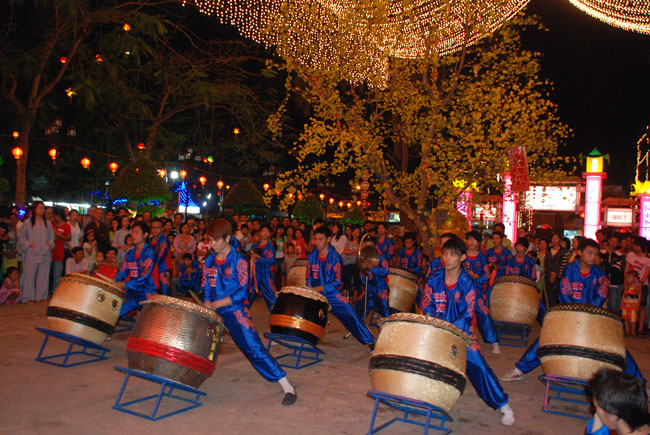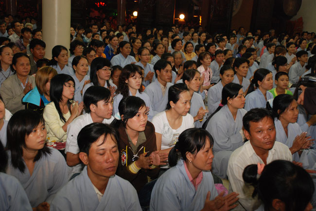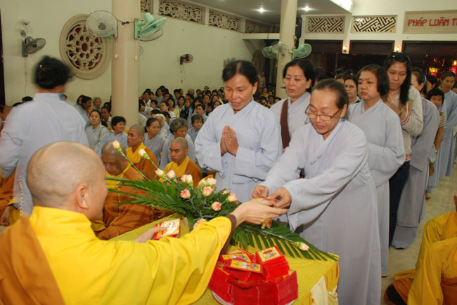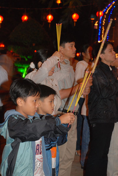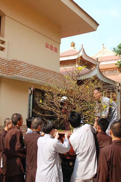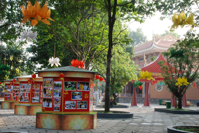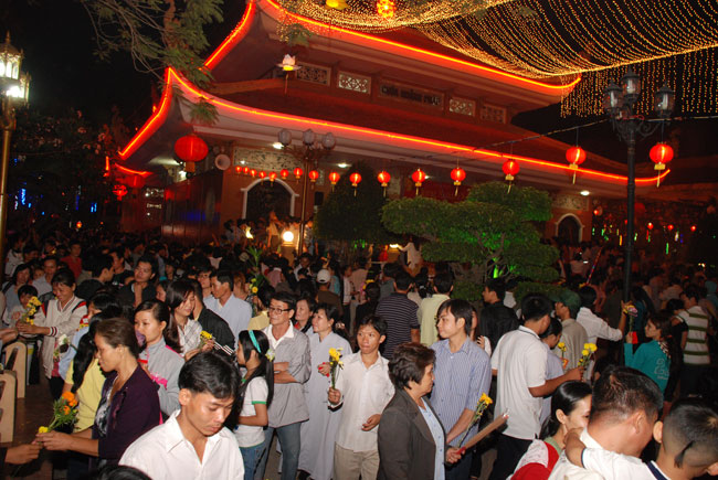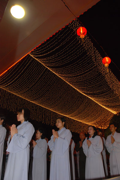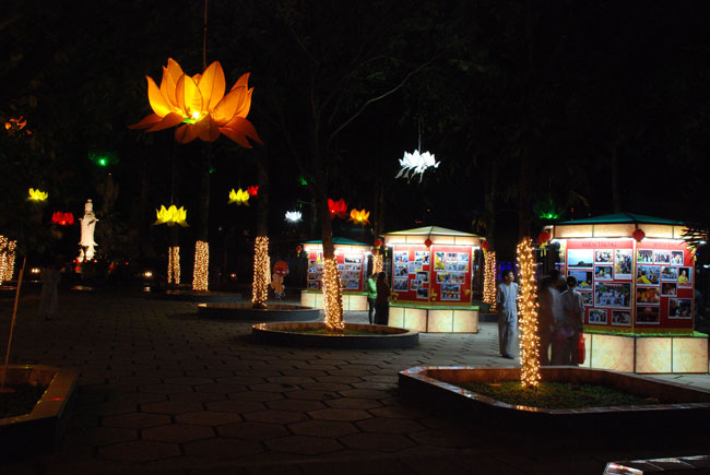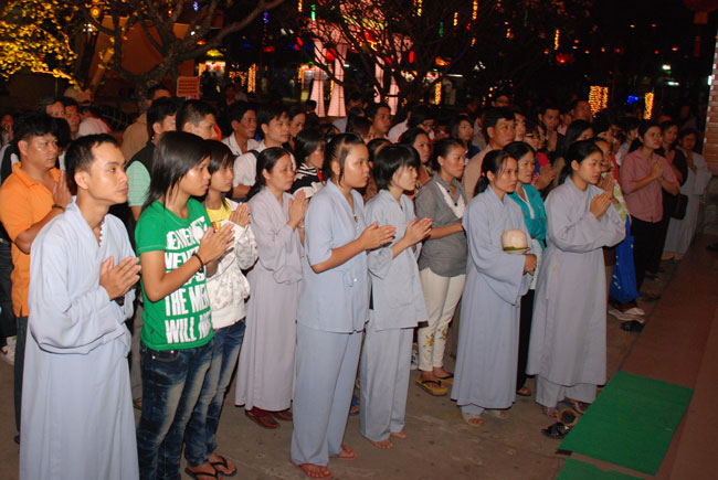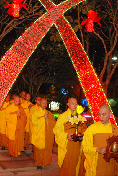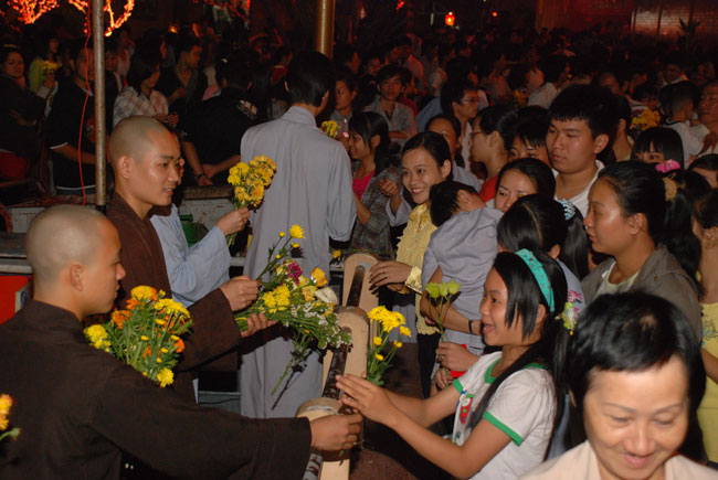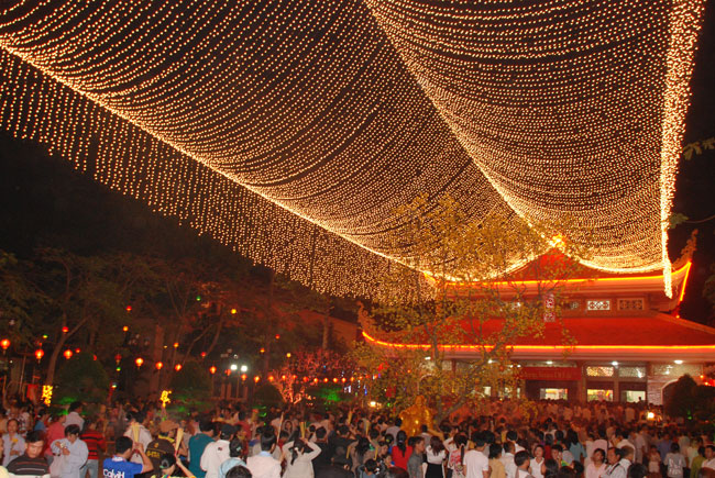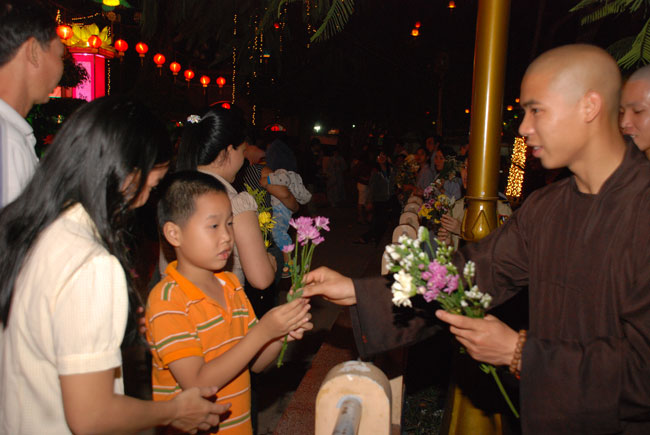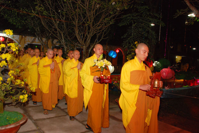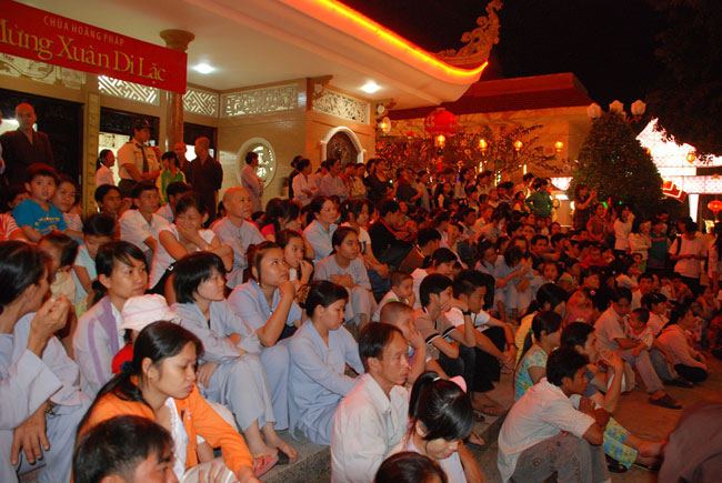 Đêm nay, một đêm thật đẹp, tiết trời se lạnh bởi không khí mùa xuân đang từng phút chuyển mình. Khuôn viên Hoằng Pháp giờ đây đang tràn ngập trong ánh sáng lung linh với bao sắc màu nhẹ nhàng, tươi tắn. Những tà áo lam nhẹ theo làn gió xuân, những em bé thơ ngây với hai bím tóc đào nở nụ cười xinh xắn, những nam thanh nữ tú gương mặt rạng ngời hân hoan chuẩn bị chào đón xuân…Thoang thoảng theo làn gió đưa mùi hương trầm làm lòng người nhẹ nhàng, hạnh phúc xen lẫn niềm xúc động trước cảnh Thiền môn. Bên hông chánh điện từng dãy hoa tươi được quý thầy xếp ngay ngắn, để rồi lát nữa đây những đóa hoa này sẽ trở thành những cành lộc xuân cho quý Phật tử đem về. Phía bên kia, đoàn múa lân sư rồng đã chuẩn bị chỉnh tề góp vui cho quý Phật tử khi thềm năm mới gõ cửa…Tất cả mọi cảnh vật đêm nay như một bức tranh sống động diệu kỳ.
