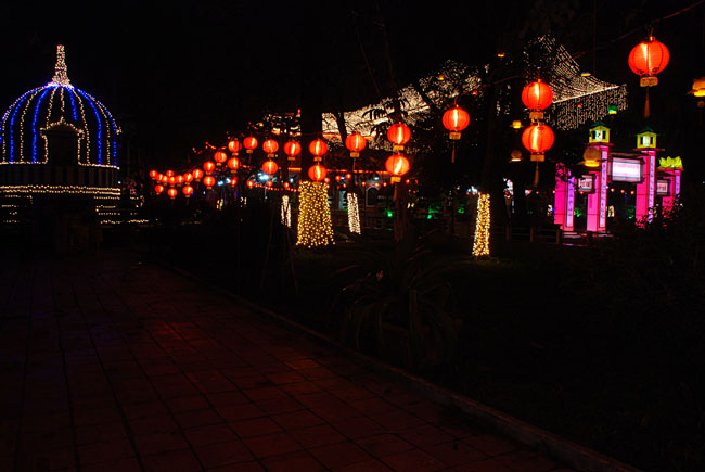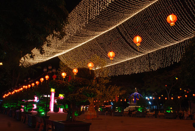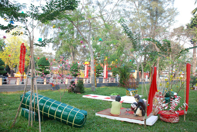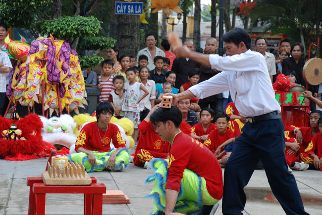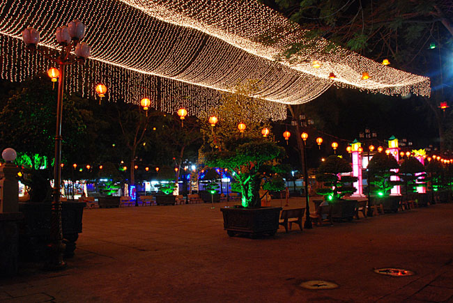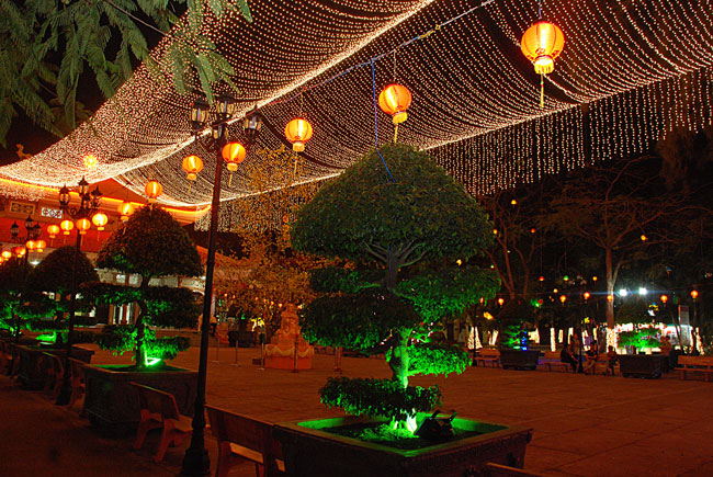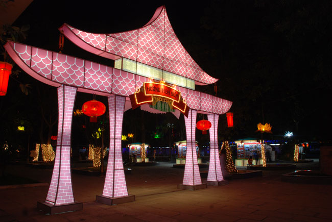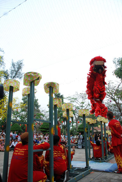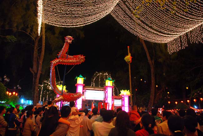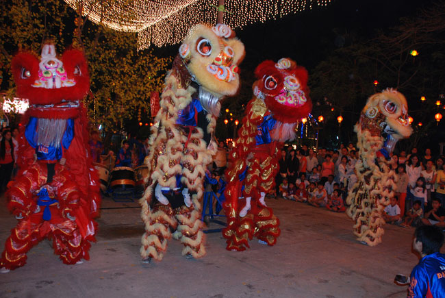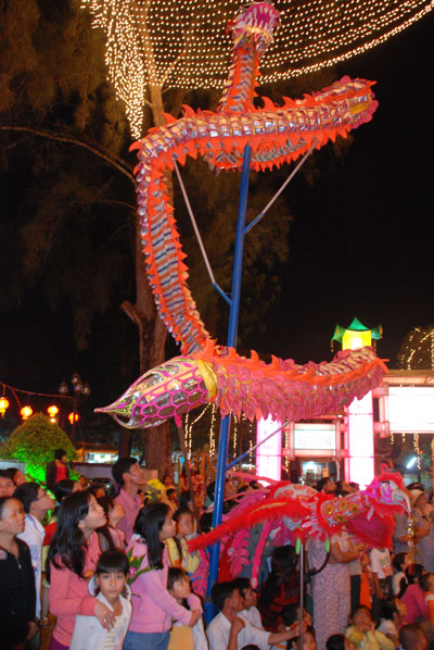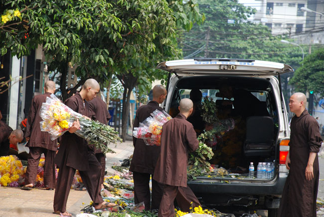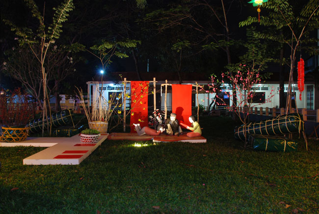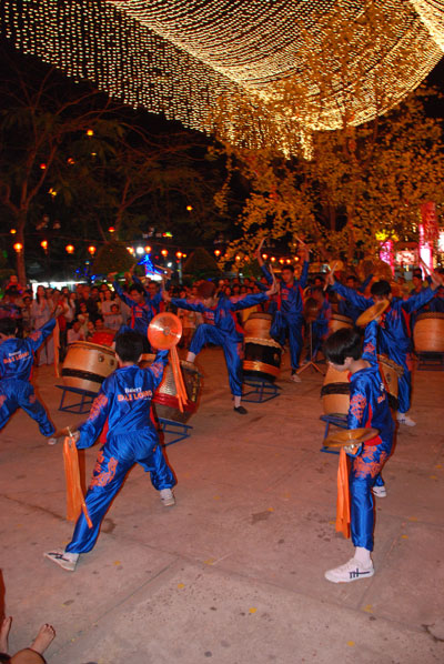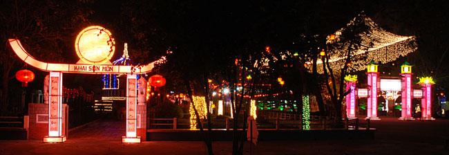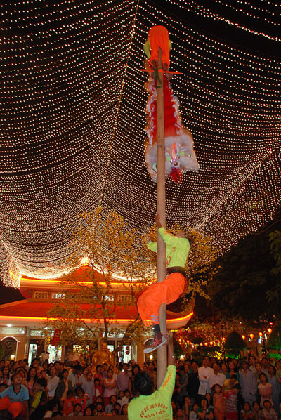 Đêm nay, một đêm thật đẹp, tiết trời se lạnh bởi không khí mùa xuân đang từng phút chuyển mình. Khuôn viên Hoằng Pháp giờ đây đang tràn ngập trong ánh sáng lung linh với bao sắc màu nhẹ nhàng, tươi tắn. Những tà áo lam nhẹ theo làn gió xuân, những em bé thơ ngây với hai bím tóc đào nở nụ cười xinh xắn, những nam thanh nữ tú gương mặt rạng ngời hân hoan chuẩn bị chào đón xuân…Thoang thoảng theo làn gió đưa mùi hương trầm làm lòng người nhẹ nhàng, hạnh phúc xen lẫn niềm xúc động trước cảnh Thiền môn. Bên hông chánh điện từng dãy hoa tươi được quý thầy xếp ngay ngắn, để rồi lát nữa đây những đóa hoa này sẽ trở thành những cành lộc xuân cho quý Phật tử đem về. Phía bên kia, đoàn múa lân sư rồng đã chuẩn bị chỉnh tề góp vui cho quý Phật tử khi thềm năm mới gõ cửa…Tất cả mọi cảnh vật đêm nay như một bức tranh sống động diệu kỳ.