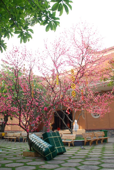 Cờ phướn khắp tung bay Hoa đào và hoa mai Sắc mầu quần áo mới Điểm tô chùa đẹp thay.