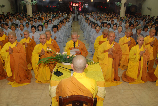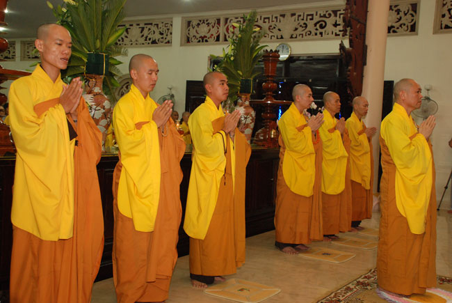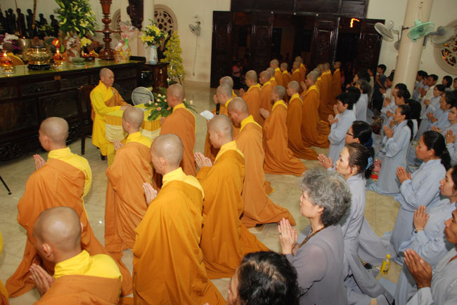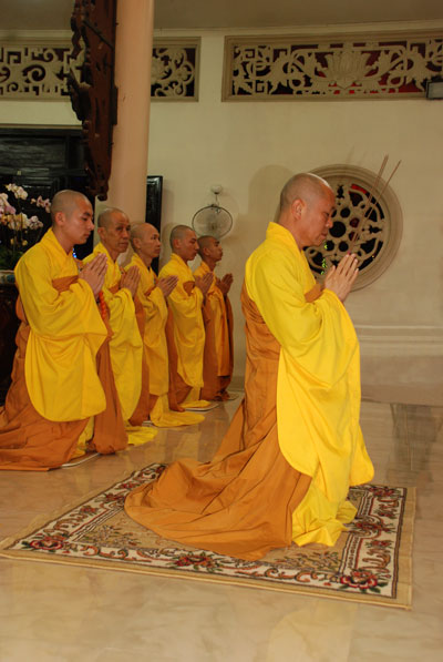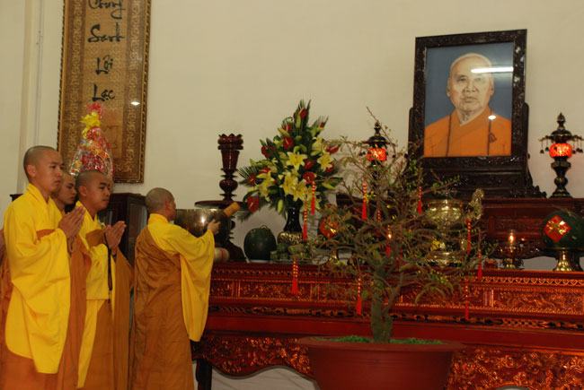 Khi chiếc đồng hồ xinh xắn gõ những nhịp cuối cùng của năm cũ, những hồi chuông trống bát nhã vang lên, năm mới đã đến đây rồi! Cảnh vật bỗng trở nên im lặng trong giây lát như để tận hưởng những giây phút thiêng liêng đầu tiên của mùa xuân. Trước và bên ngoài sân chánh điện, hàng Phật tử và du khách thập phương đã chỉnh tề ngay ngắn chuẩn bị cung nghinh Chư Tôn Đức. Khi hồi chuông trống bát nhã vừa kết thúc thì tại nơi chánh điện, từng bước chân giải thoát của quý Ngài đã quang lâm.