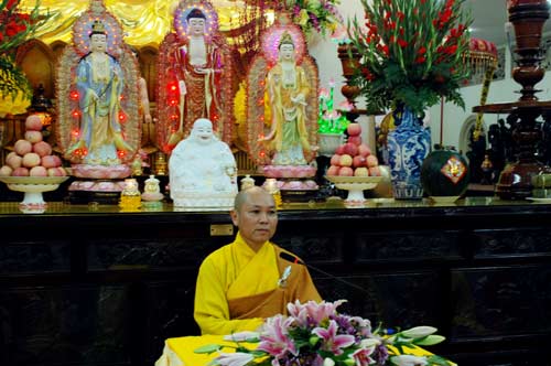 Khi khoảnh khắc giao thừa chỉ còn trong tích tắc cũng chính là lúc ba hồi chuông trống Bát Nhã vang lên hùng hồn cung nghinh chư tôn đức quang lâm chánh điện. Thượng tọa Thích Chân Tính cùng chư tôn đức đã niêm hương bạch Phật trong sự trang nghiêm và ấm áp trước thềm năm mới. Sau đó là khóa lễ bái sám của chư tăng và toàn thể Phật tử, nhằm gội rửa những lo âu và phiền muộn của năm cũ, nguyện cầu năm mới đạt được nhiều niềm vui và hạnh phúc. Để khai mạch cho niềm hỷ lạc, TT. Thích Chân Tính đã có buổi Pháp thoại ngắn, trao truyền những lời pháp êm dịu, cầu cho thế giới hòa bình, đạo pháp xương minh, tăng già hòa hợp, bá tánh hạnh phúc. Kết thúc buổi pháp thoại, Thượng Tọa đã trao lộc đầu năm cho toàn thể quan khách và Phật tử.